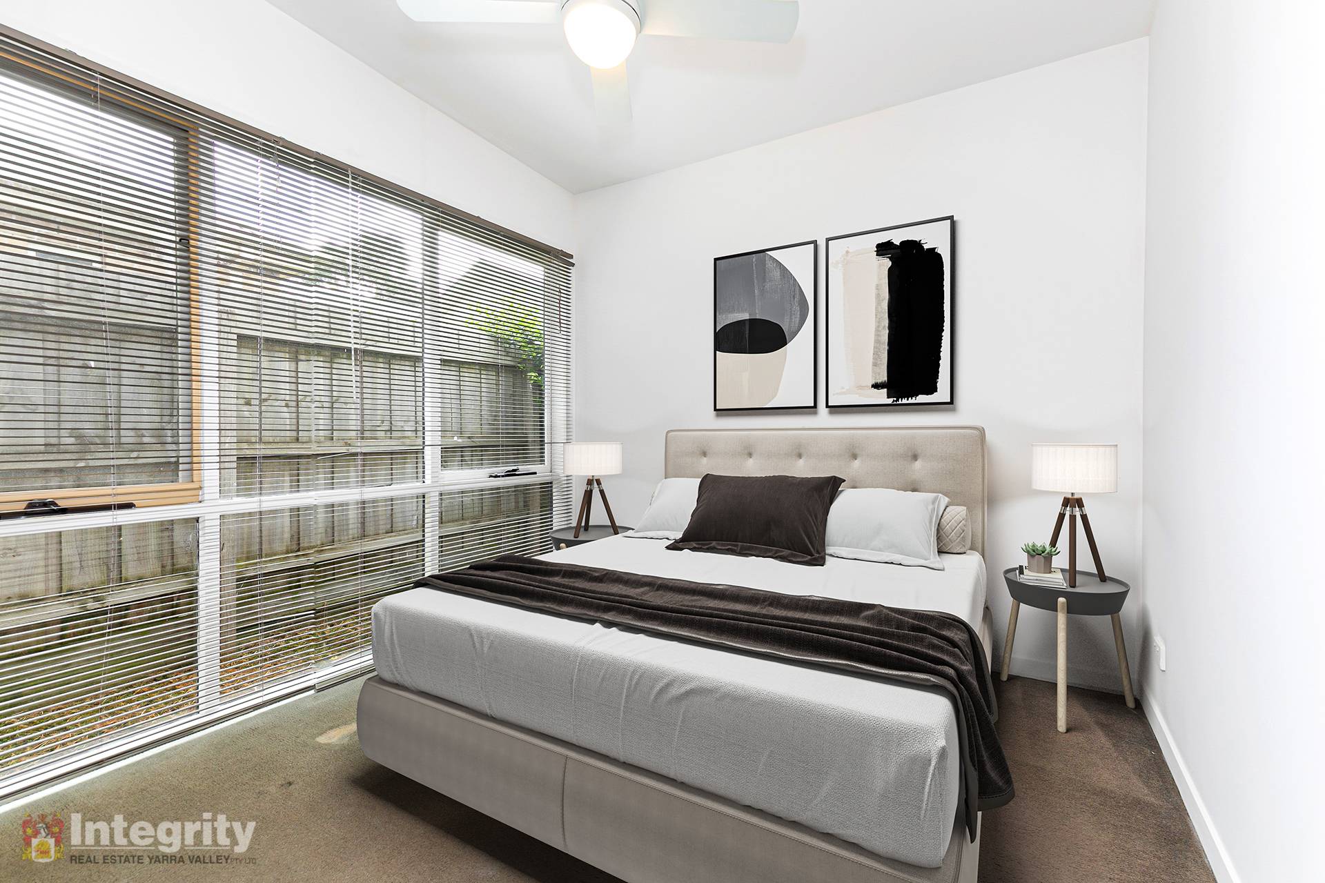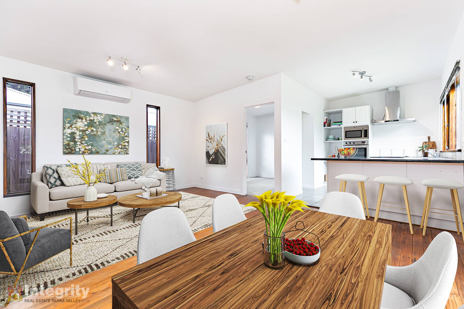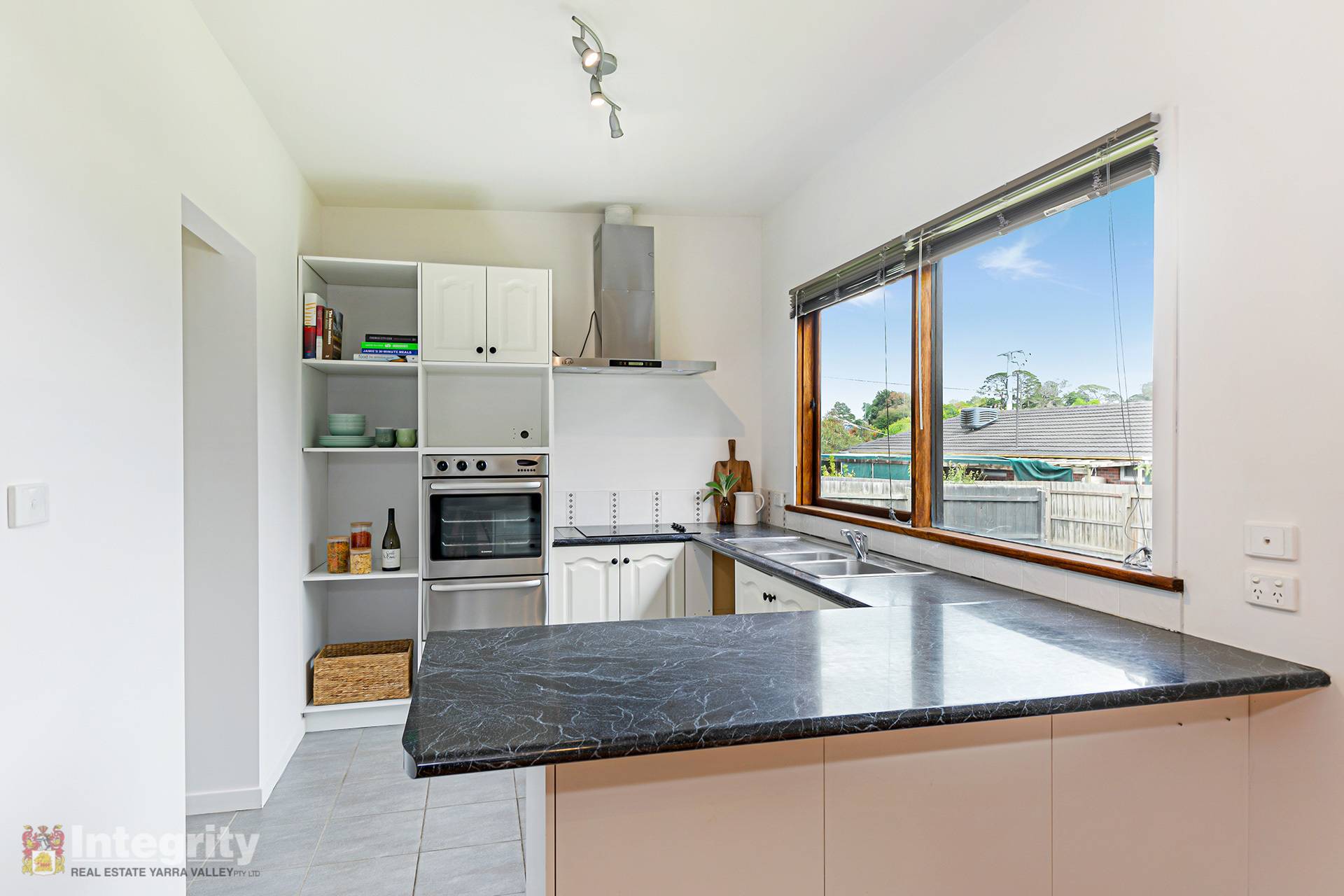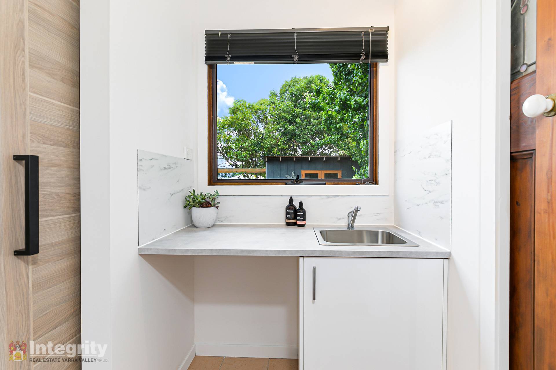 Having a pleasant northerly aspect allows the sun to drench the yard and the large windows into the living areas capture the light and warm of it. The land is fully fenced with some lovely espalier trees lining the drive way leading to the cottage along with some fresh veggie patches. This great location is just minutes' drive from Healesville central and within walking distance to other attractions such as Four Pillars distillery.