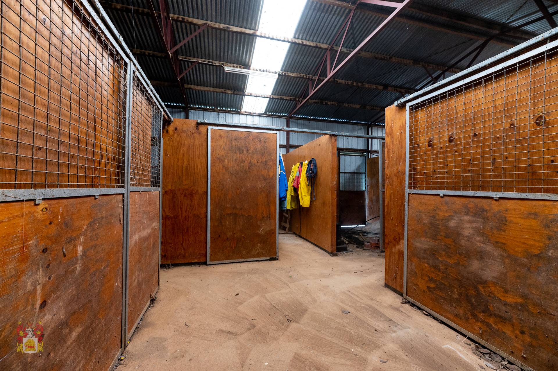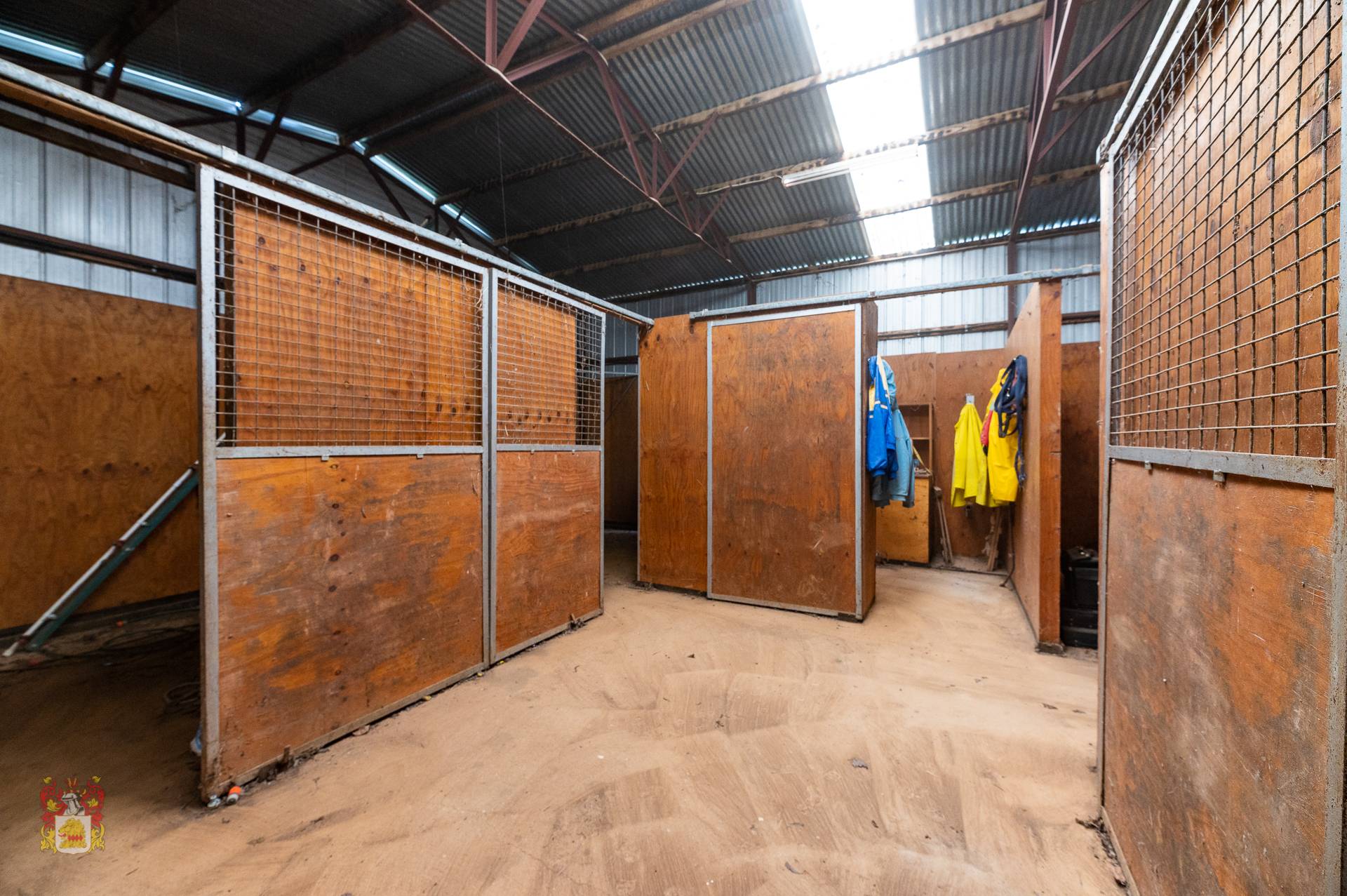 - 18 x 8 m approx. shed/stables with garage area, workshop, tack room with feed bins + 4 horse boxes all with their own access in to the paddocks. It also has lights and power throughout.