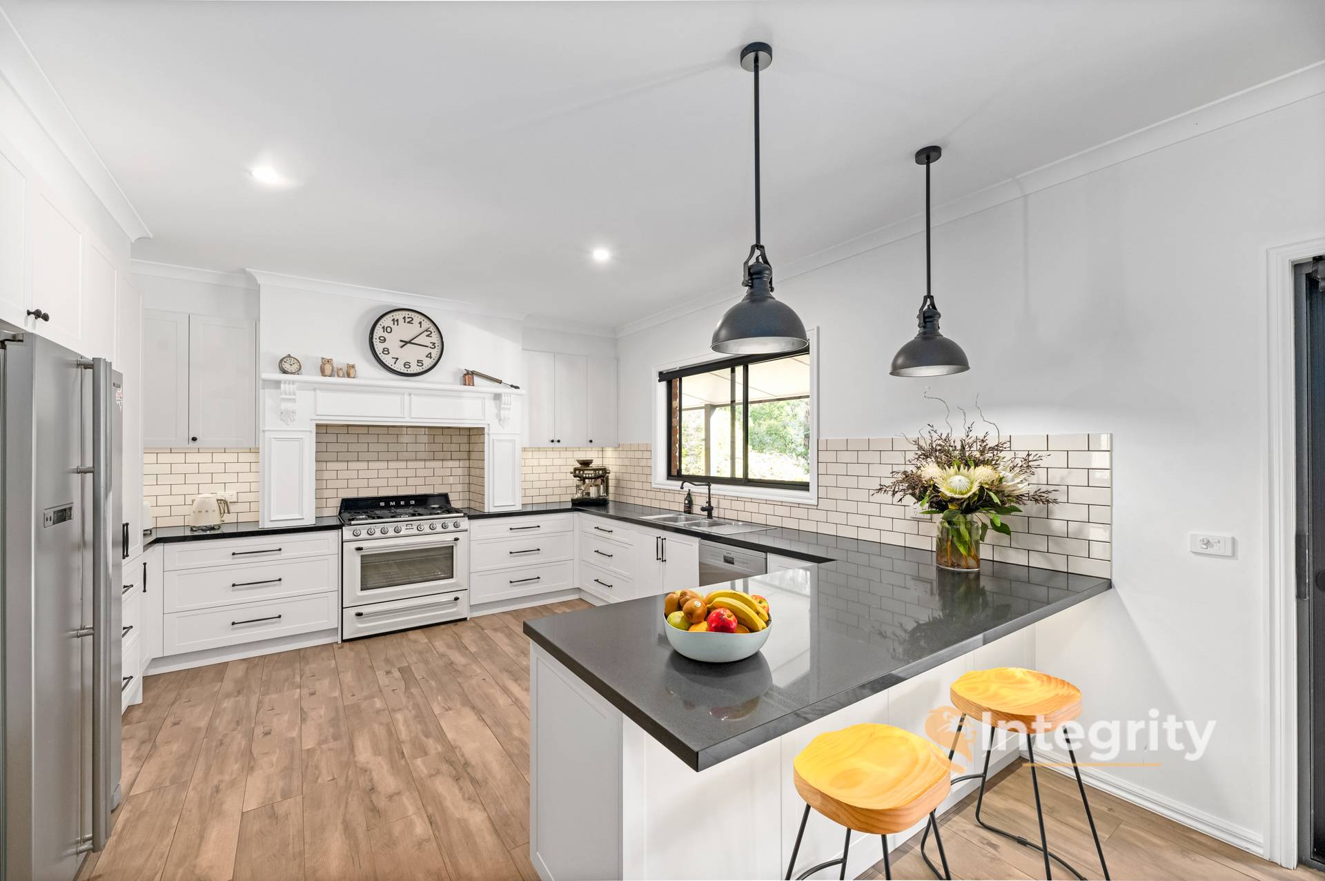 Internally, this beautifully presented family home provides warmth and ambience like no other. Welcoming you through the front door you are greeted with a formal entrance space which leads you directly to the heart of the home, the kitchen. This is not just any kitchen, this is the kitchen of your dreams featuring the stunning Smeg Victoria free standing oven, Caesarstone benchtops, double pantry, soft closing draws, plumbed fridge, plentiful amounts of bench space, breakfast bar with character pendant lights overhead, and the prettiest view overlooking the outdoor entertainment space and private gardens beyond.