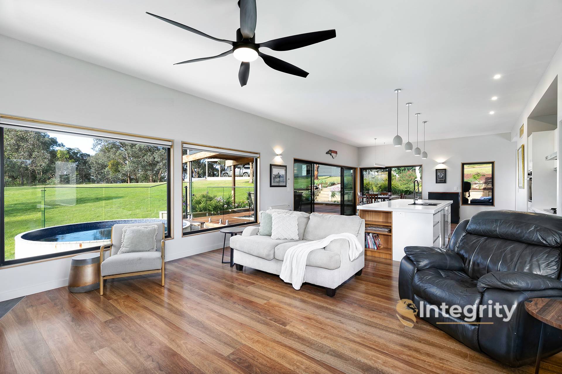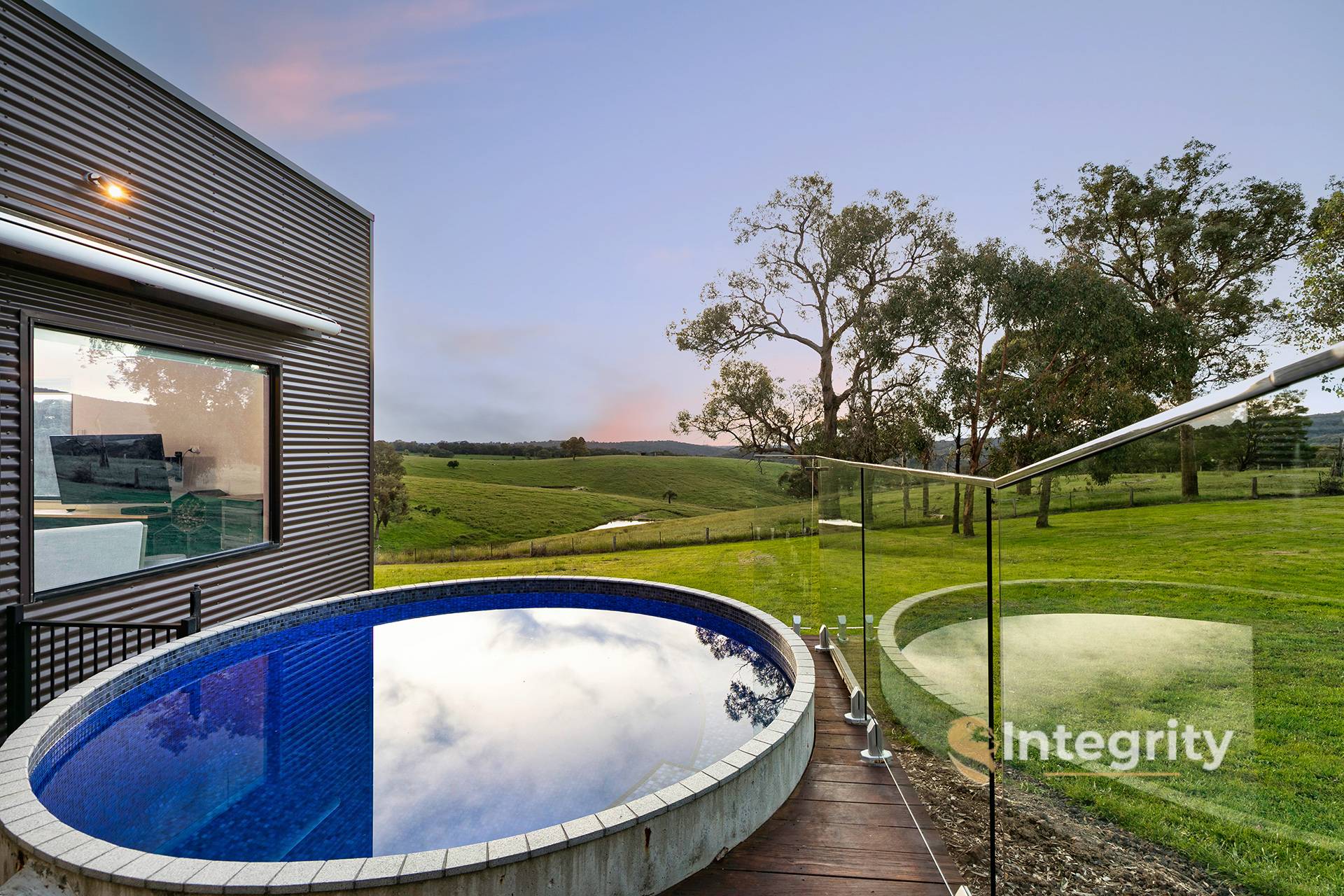 The winding driveway leads you through 18 immaculate acres directly to undercover parking connecting you to the main entrance of the home where you're greeted with a mini mudroom space with coat racks, inbuilt bench seat and cupboards. Be captivated by the soaring 9ft ceilings, spotted gum flooring and square set cornices. The modern light filled home presents 4 generous bedrooms, 3 bathrooms/en suites and 2 living rooms. Its refined spaces partner with an expansive open plan living, dining, and kitchen. The contemporary and striking kitchen is the true heart of the home with huge island bench featuring Caesar stone benchtops, walk in pantry, gas cooktop, Bosch dishwasher and soft closing cabinetry. This open plan living space extends through dual sliding doors onto the intimate outdoor undercover entertainment deck overlooking your very own private oasis and luxurious solar heated plunge pool.