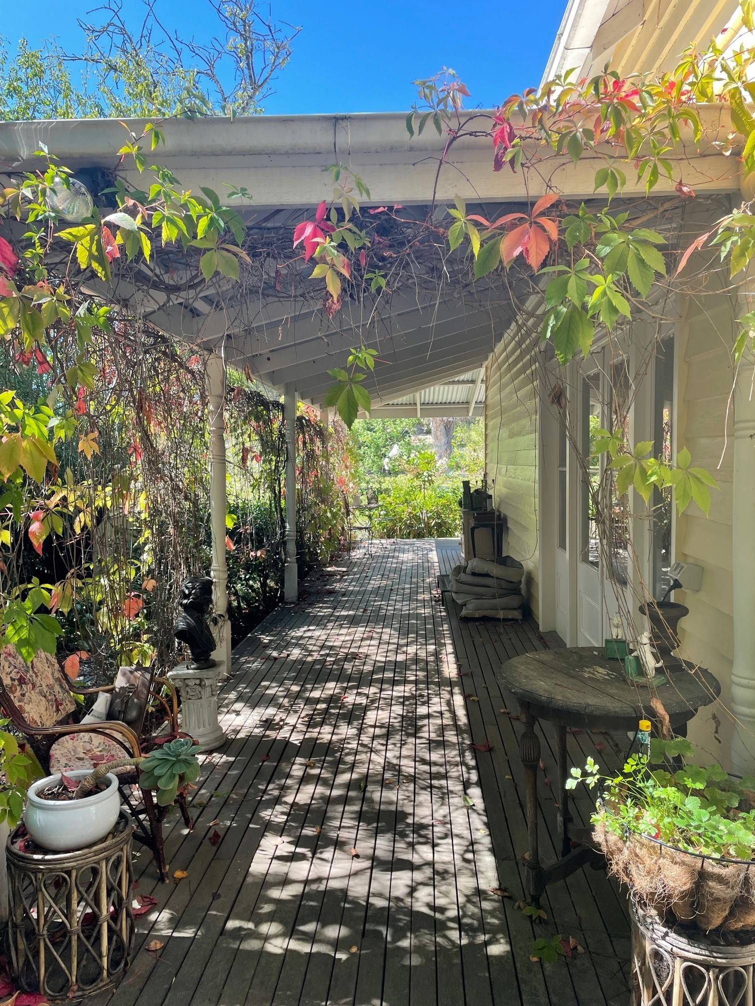 This open plan space is abundant with soft light filtering in through the 3 French doors from the deciduous vine screened veranda.