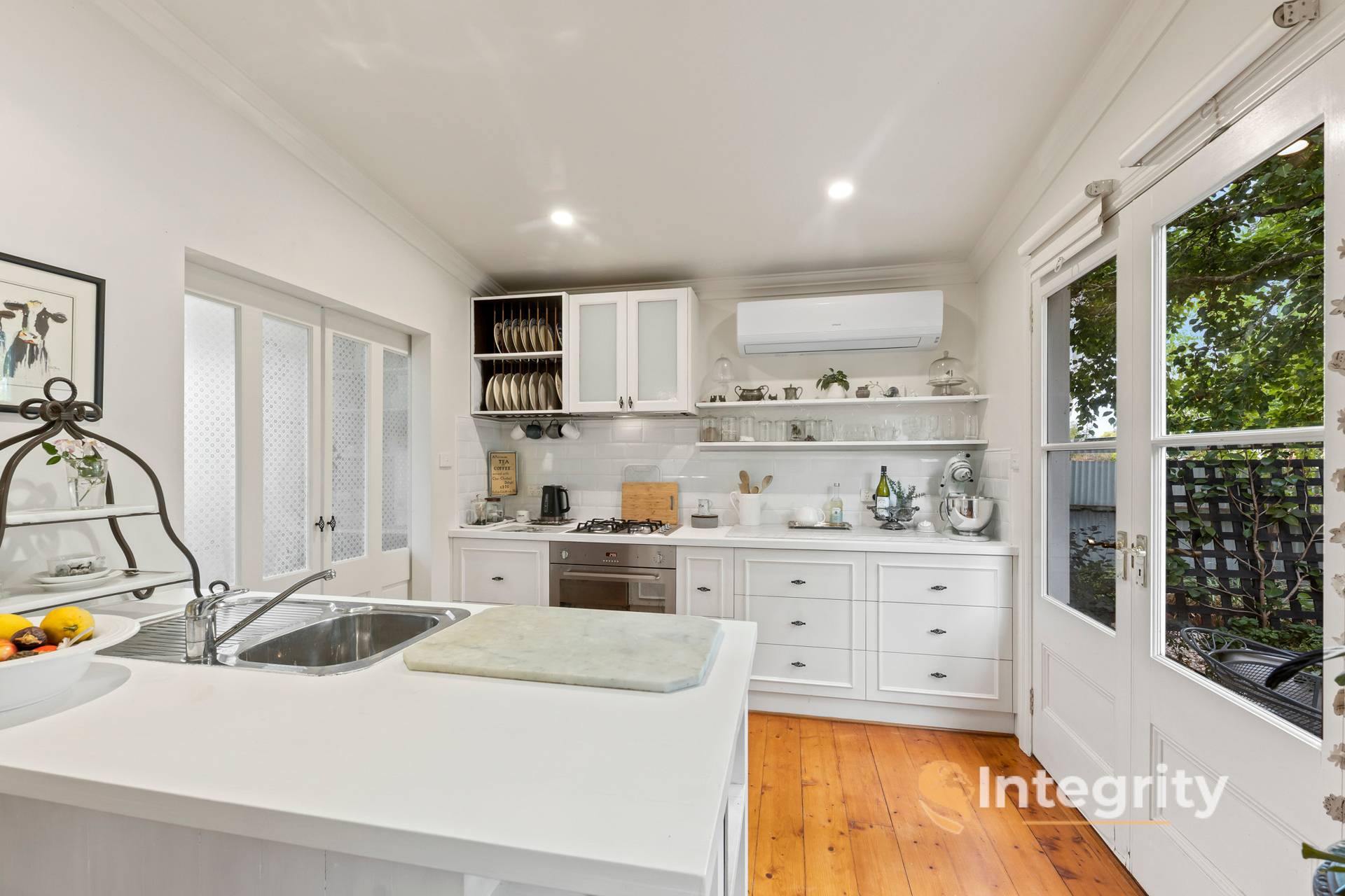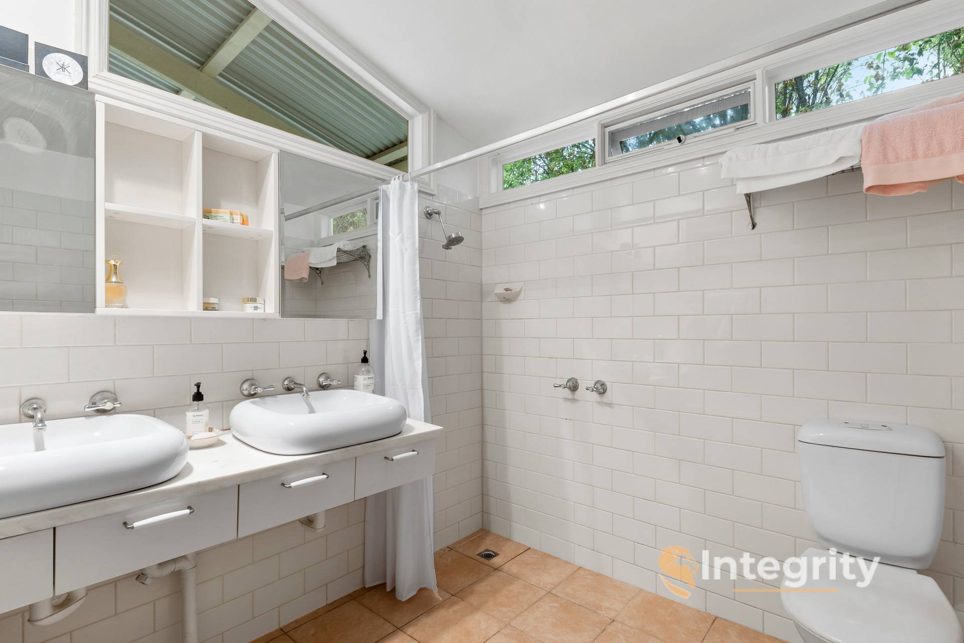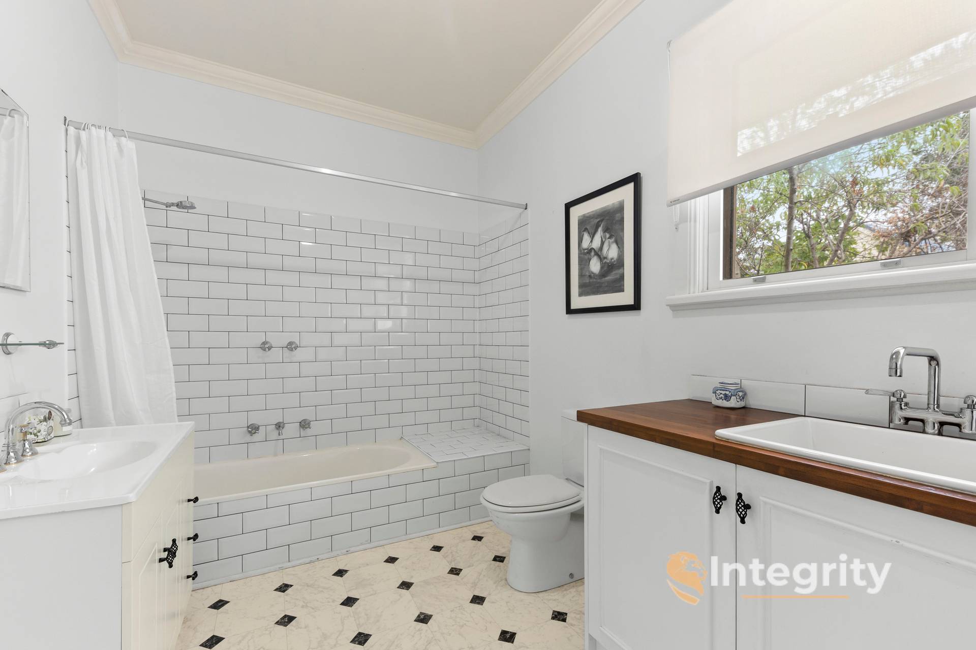 The main bathroom, which is also accessible from the 3rd bedroom, is a light filled space with shower over bath and toilet; the laundry is also situated within this bathroom - with a farm-style laundry sink and space for a washing machine and possibly a dryer.