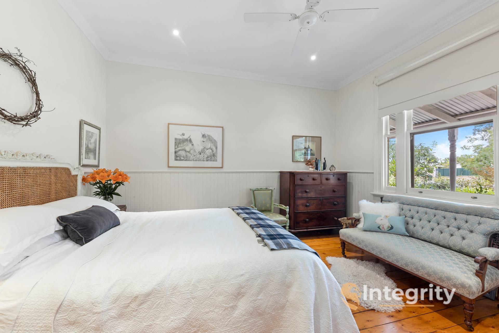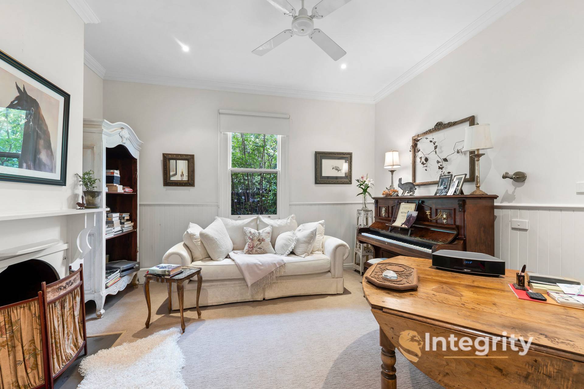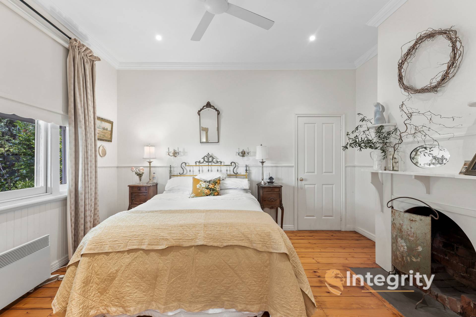 The main bedroom with its garden views, has a built-in robe, ensuite and open fireplace. Across the hall is the 2nd bedroom, a peaceful space again with views into the front garden. The 3rd bedroom, which is carpeted, has an open fireplace, blinds, ceiling fan, and includes a bookcase.