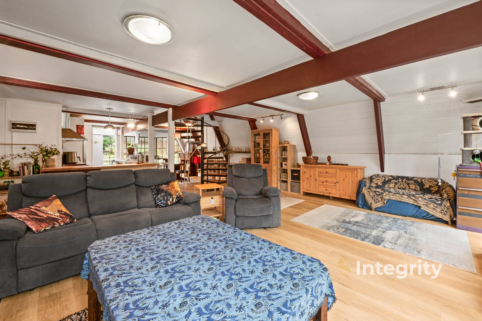 The A-frame home boasts Hardie plank construction on concrete stumps, providing durability and a rustic appeal. As you step inside, you'll be greeted by a beautiful custom made spiral staircase that adds a touch of elegance and uniqueness to the home.