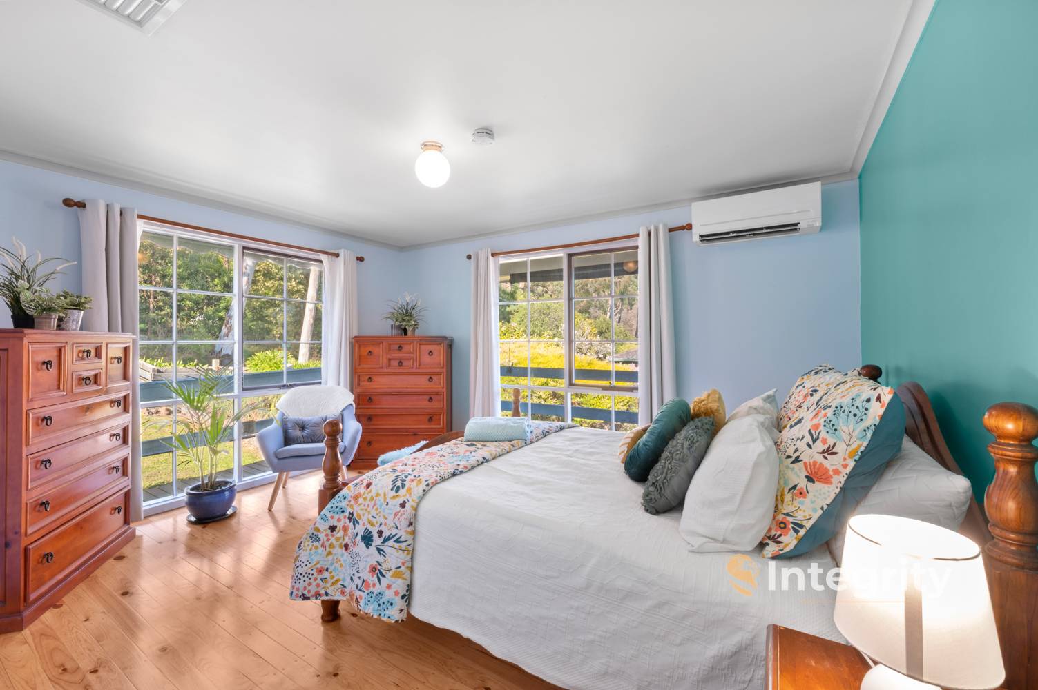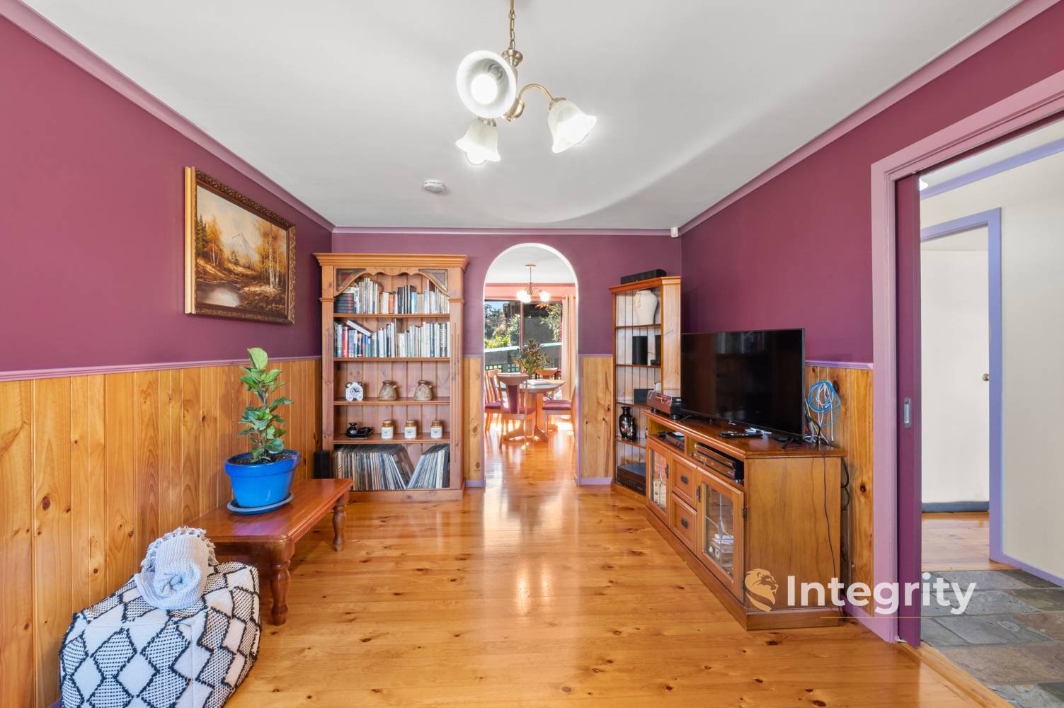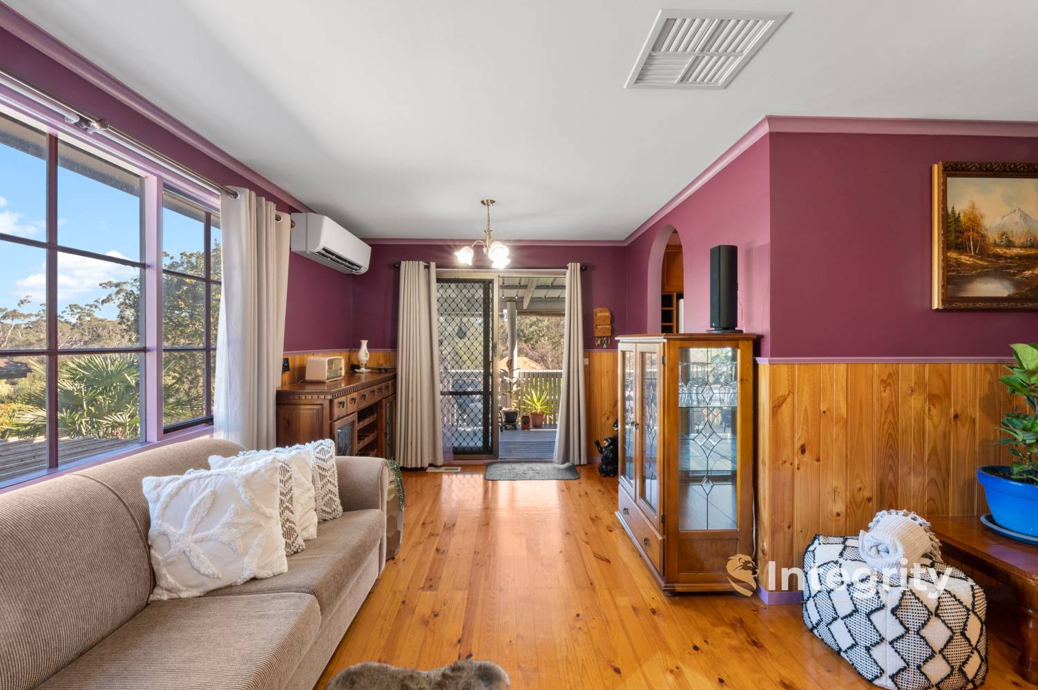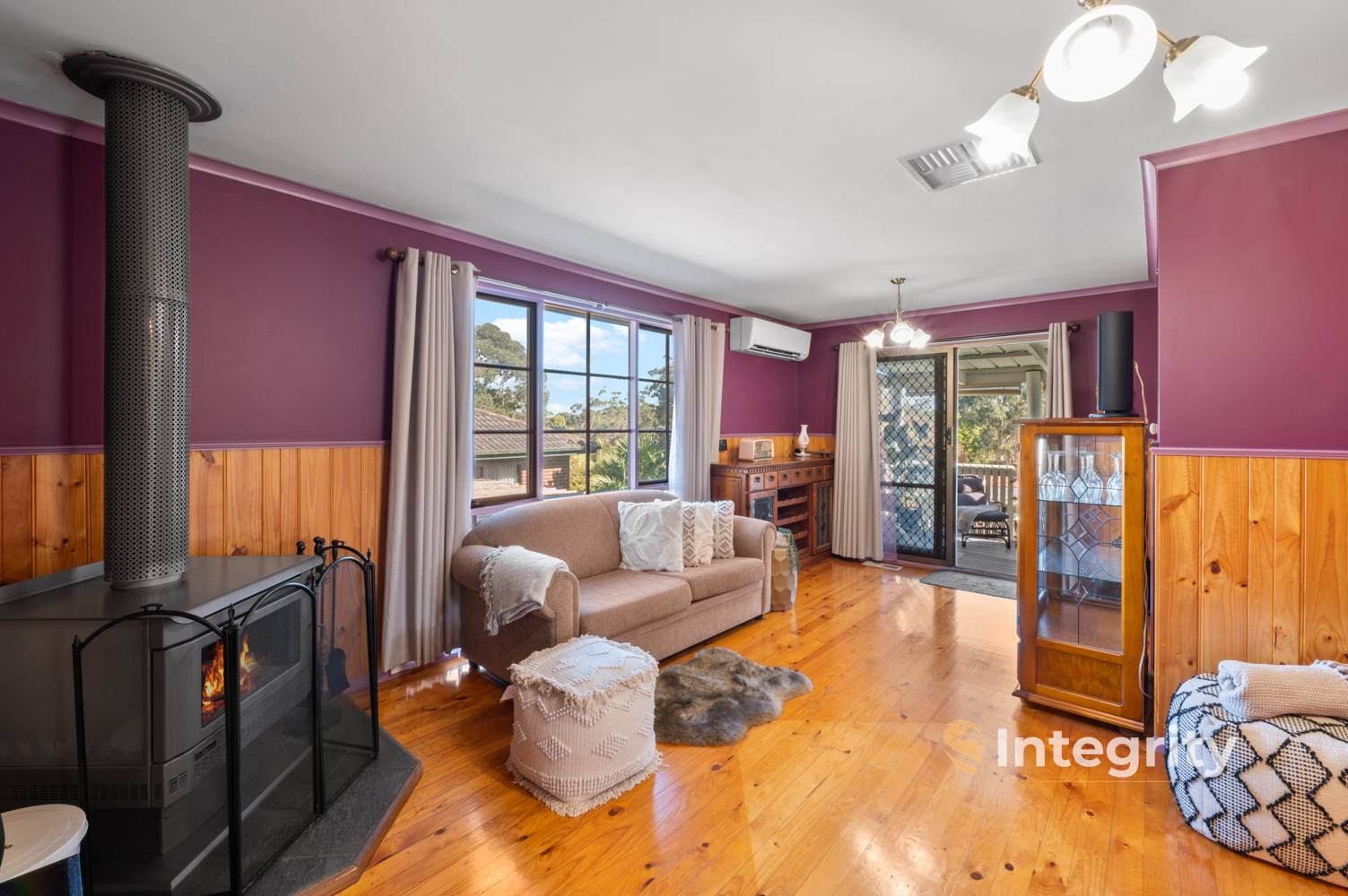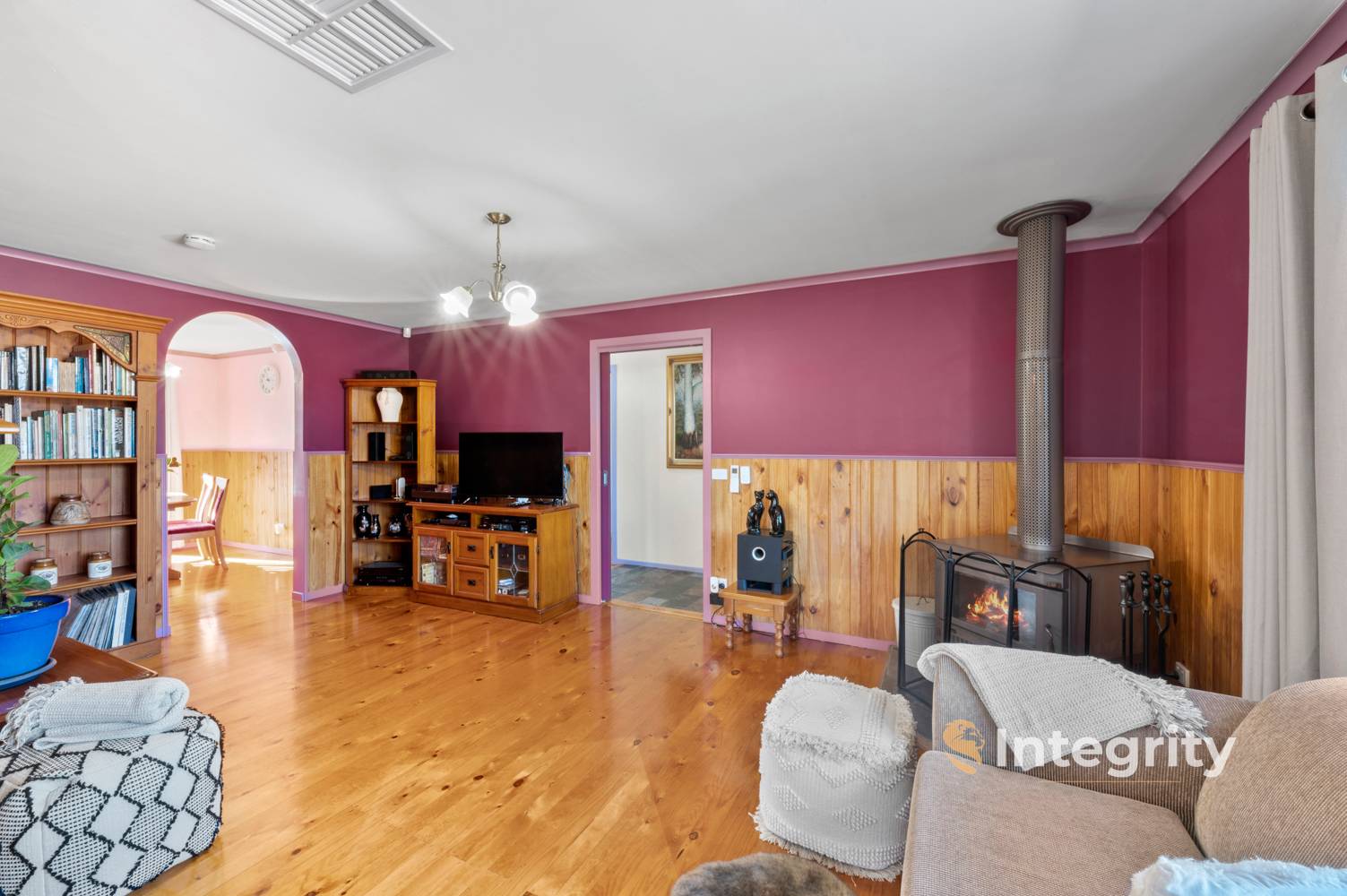 Enter the home from the front patio, stepping from the entryway into the inviting lounge with elegant floorboards and wood panelled dado's creating a warm atmosphere. Your comfort is ensured with heating & cooling options including a Wood Log Burner, Reverse Cycle Split System, and Evaporative Cooling.