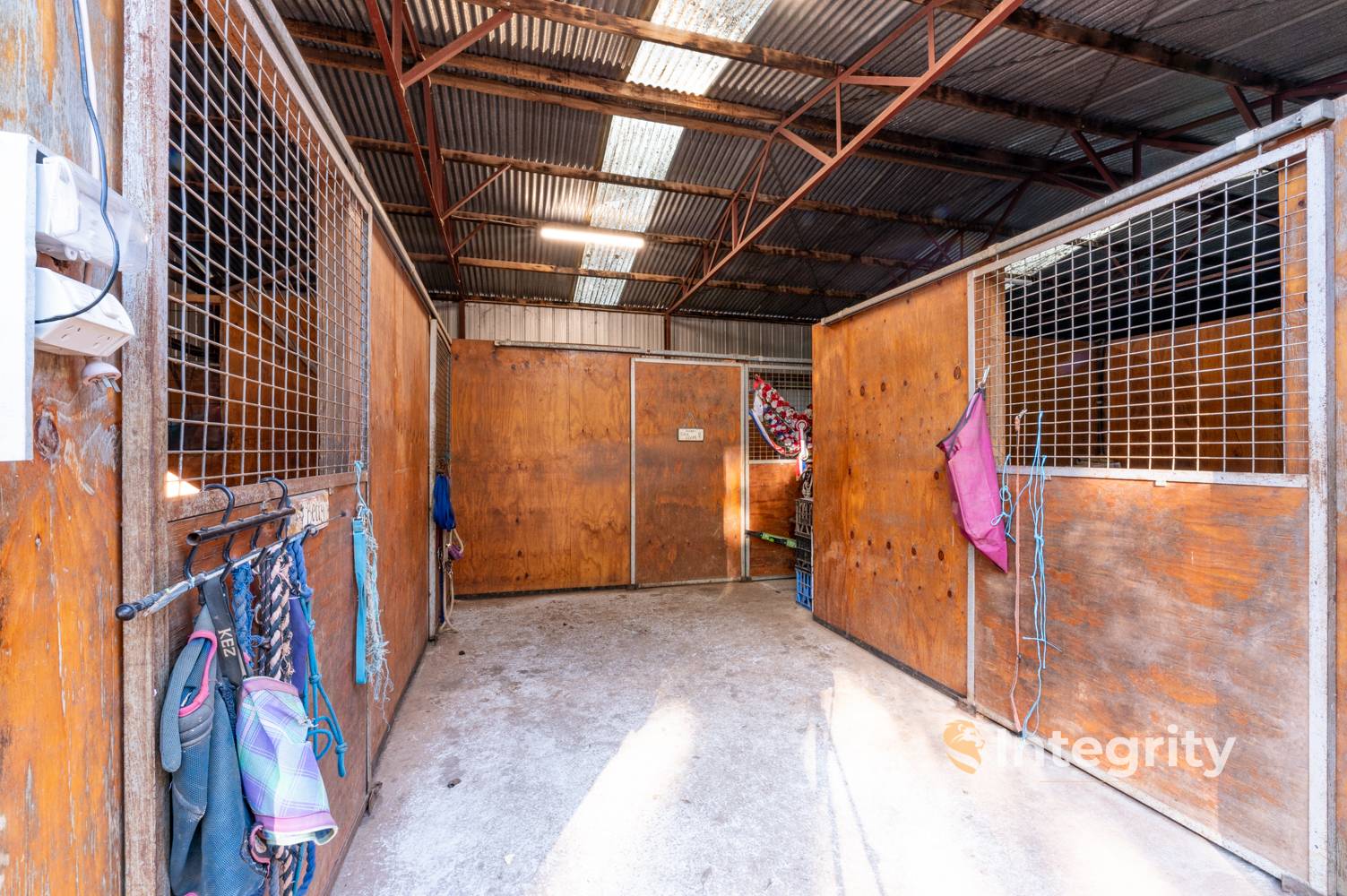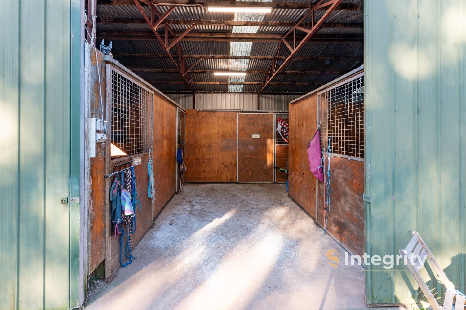 - 18x8m approx. shed/stables with garage area, workshop, and tack room with feed bins + 4 horse boxes with access to the paddocks.