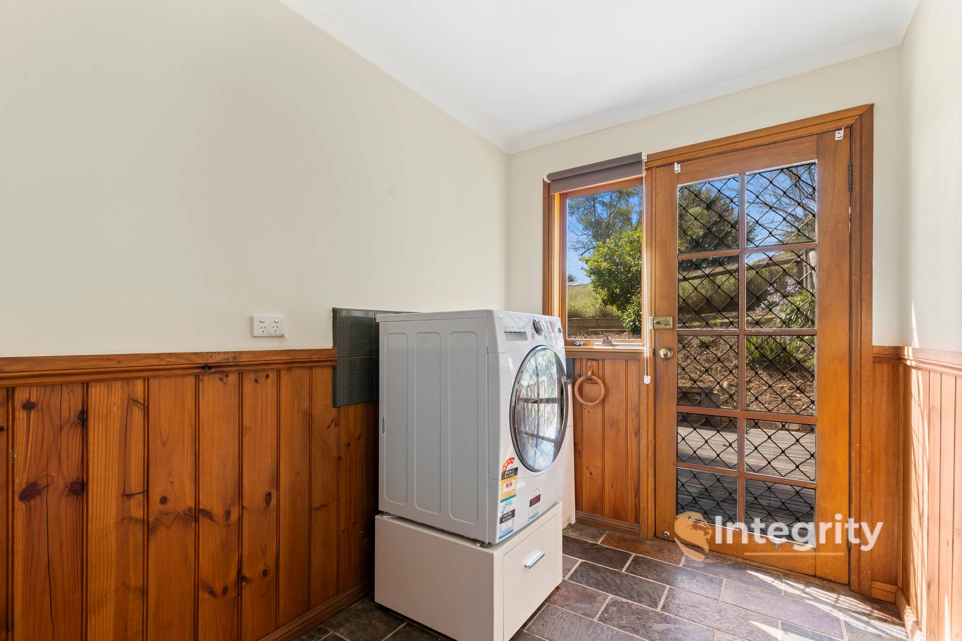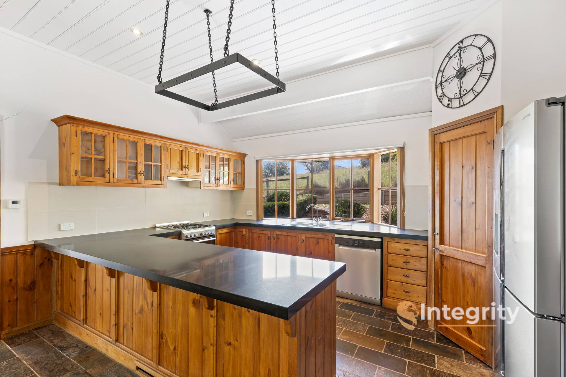 The heart of the home lies in its timber-featured kitchen, complete with ample bench space and storage. This opens into the dining room/family room with character slate floors that flow through this whole area. The thoughtful design ensures a seamless flow between the living spaces, creating an environment that is both functional and aesthetically pleasing.