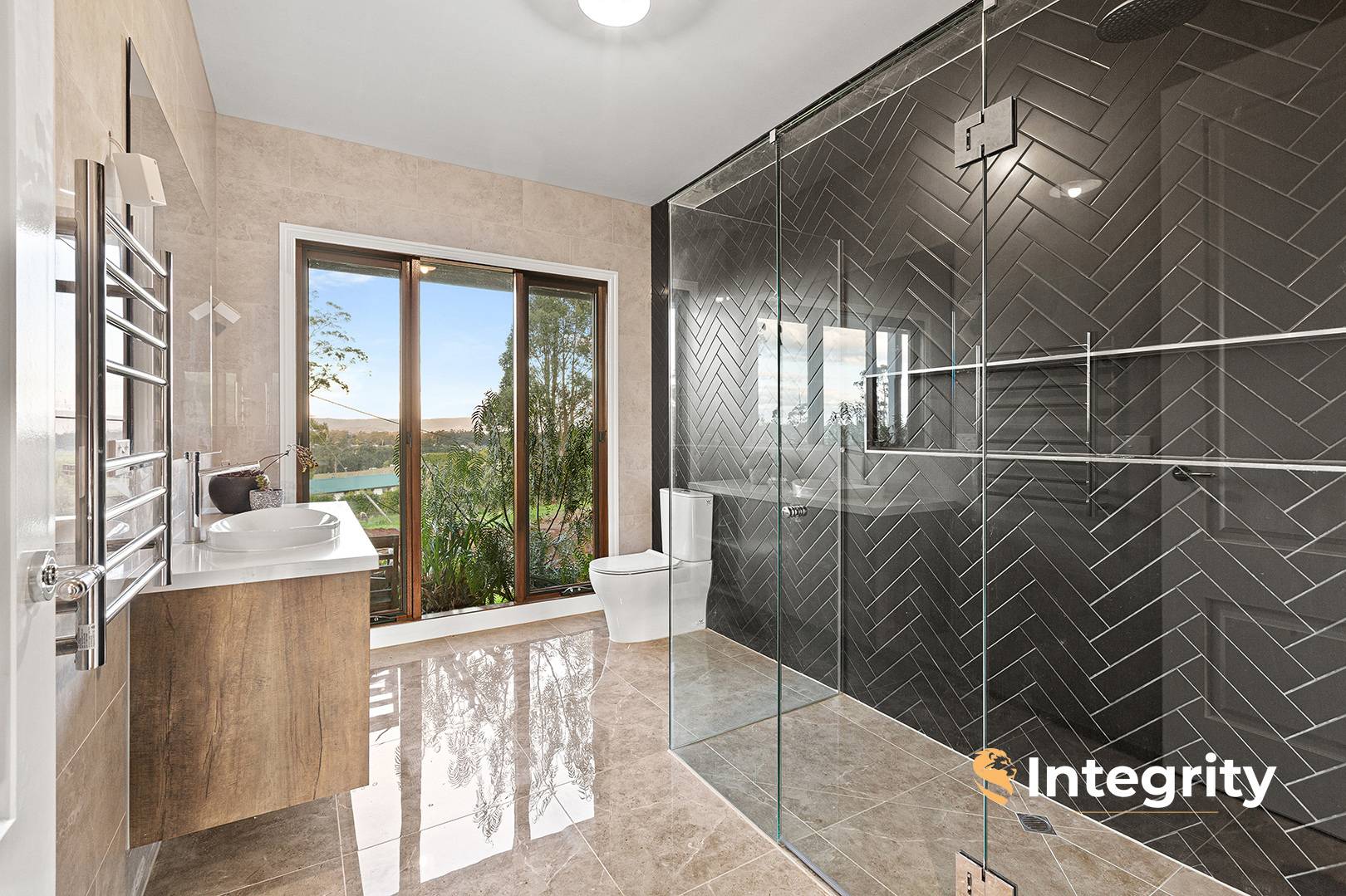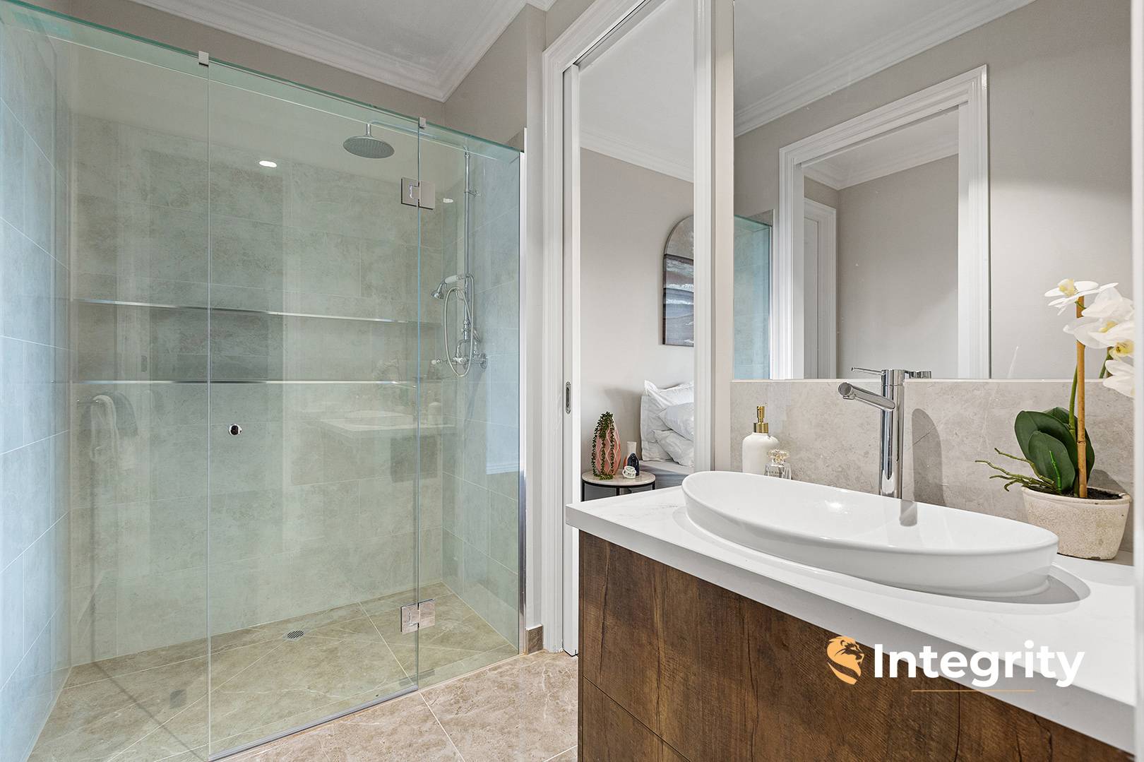 The guest bathroom features a wall-to-wall 1200mm shower, single vanity, and toilet. The main bathroom offers a semi-frameless shower, marble stone benchtop with a single vanity, convenient shower niche, and all with floor-to-ceiling tiles.