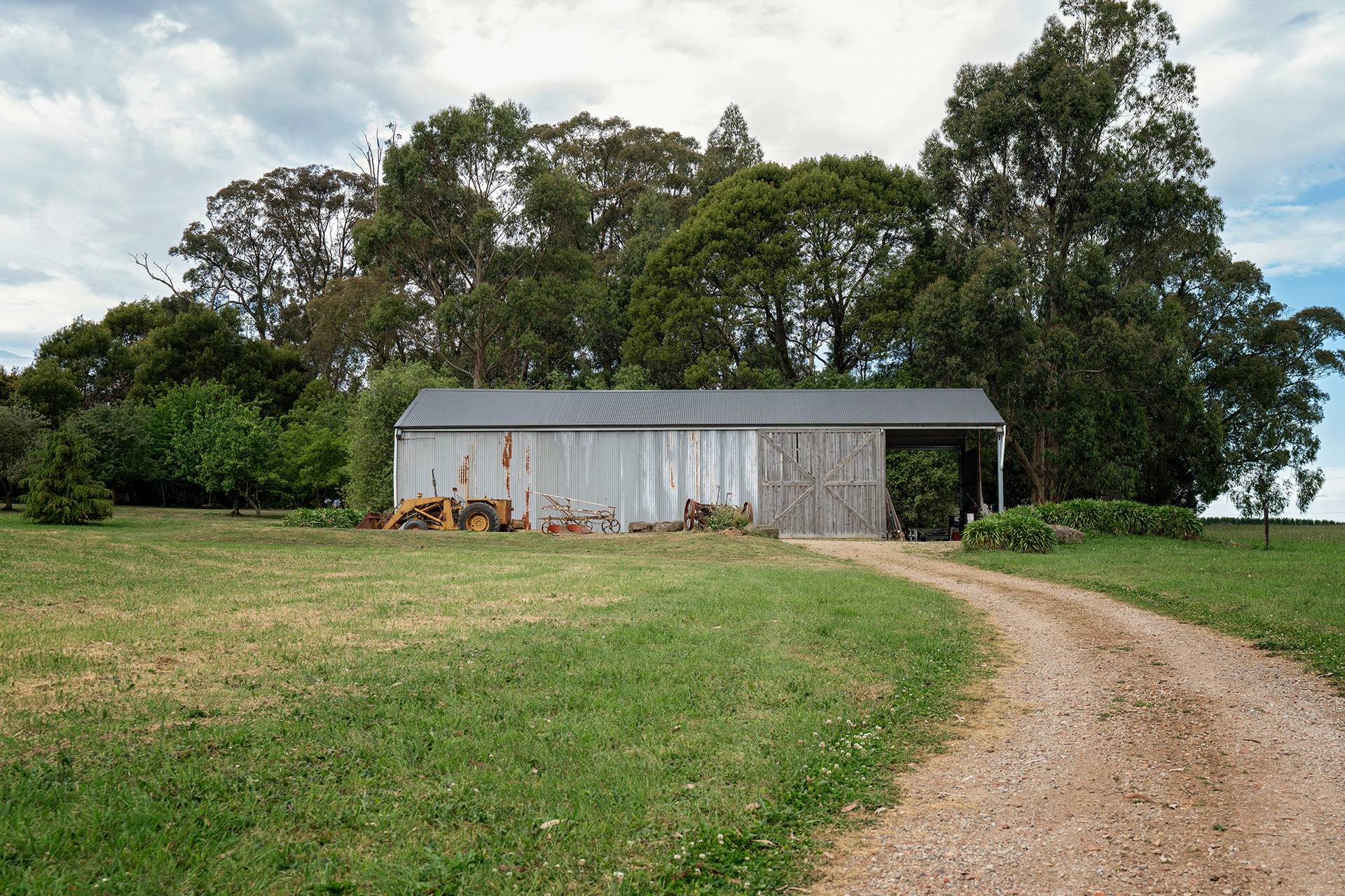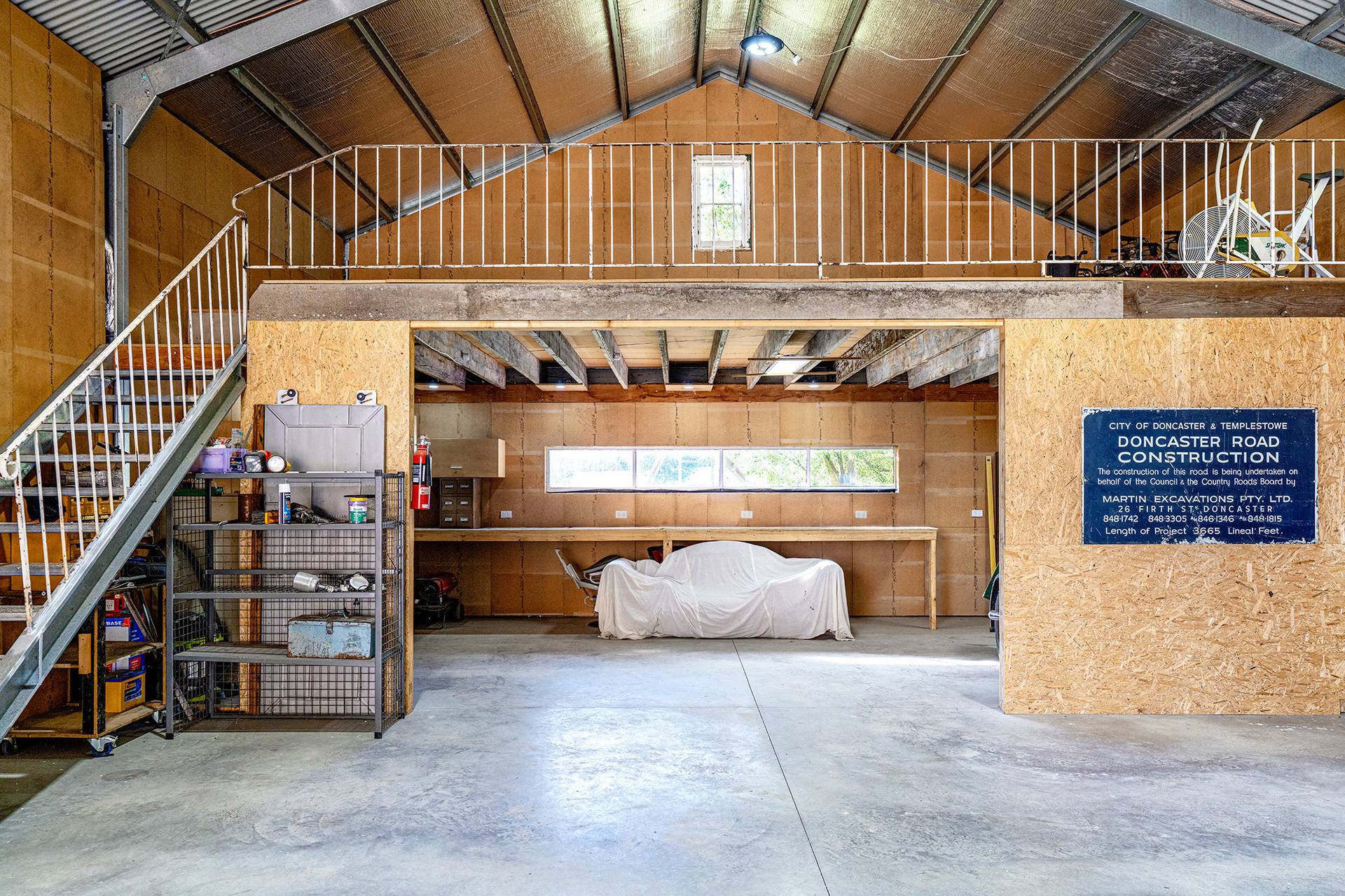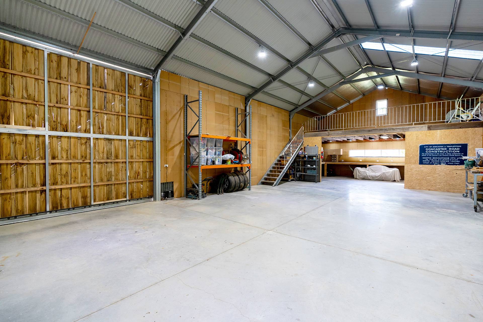 A newly built machinery shed of 22.5m x 9m with a 6m high roof perfect for larger equipment, comprising an 18m enclosed section, a 4.5m x 9m mezzanine, and a 4.5m x 9m carport. The shed features a 150mm thick concrete slab, Aircel-lined roof, LED lighting, and power with its own circuit board.