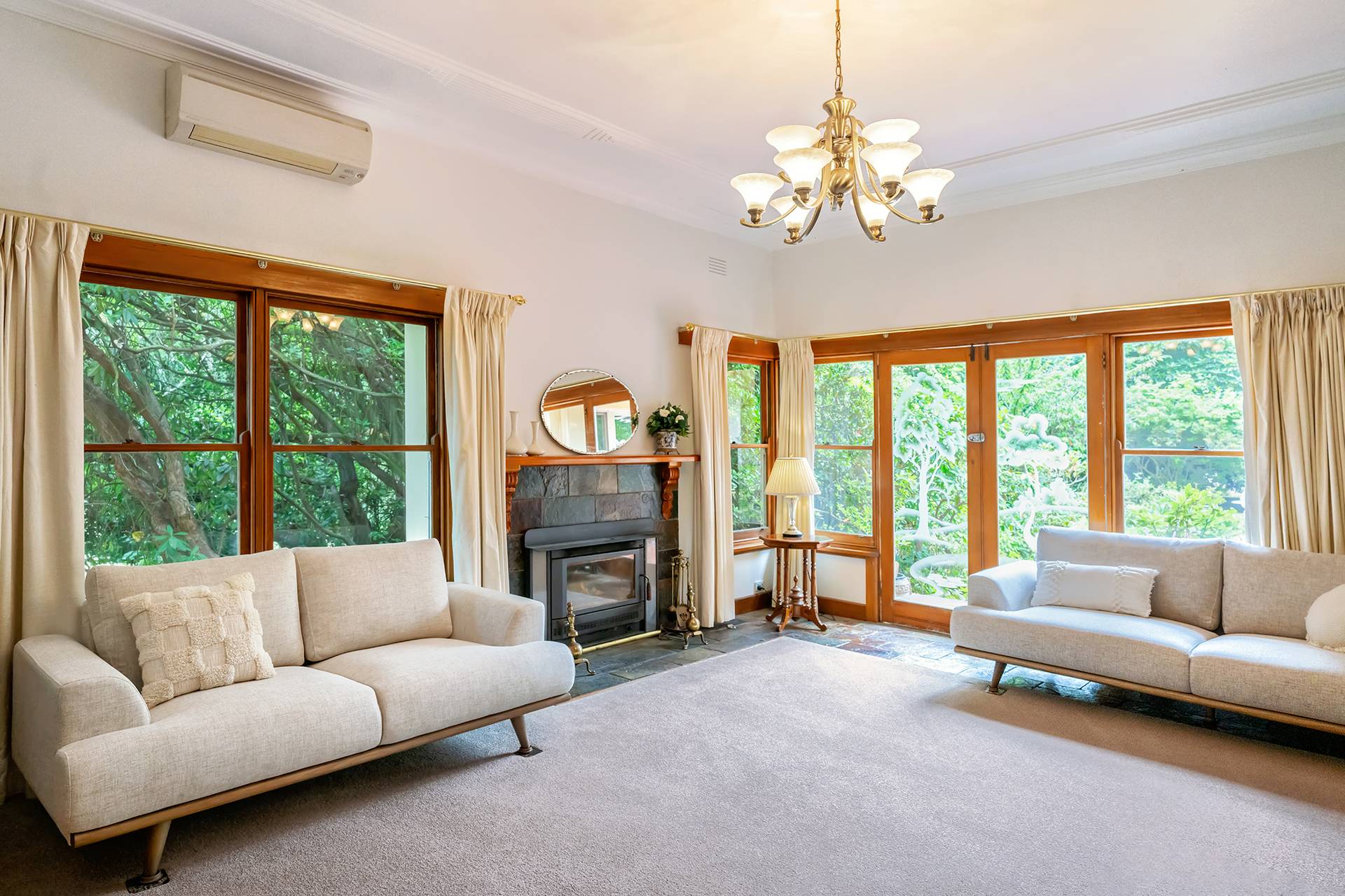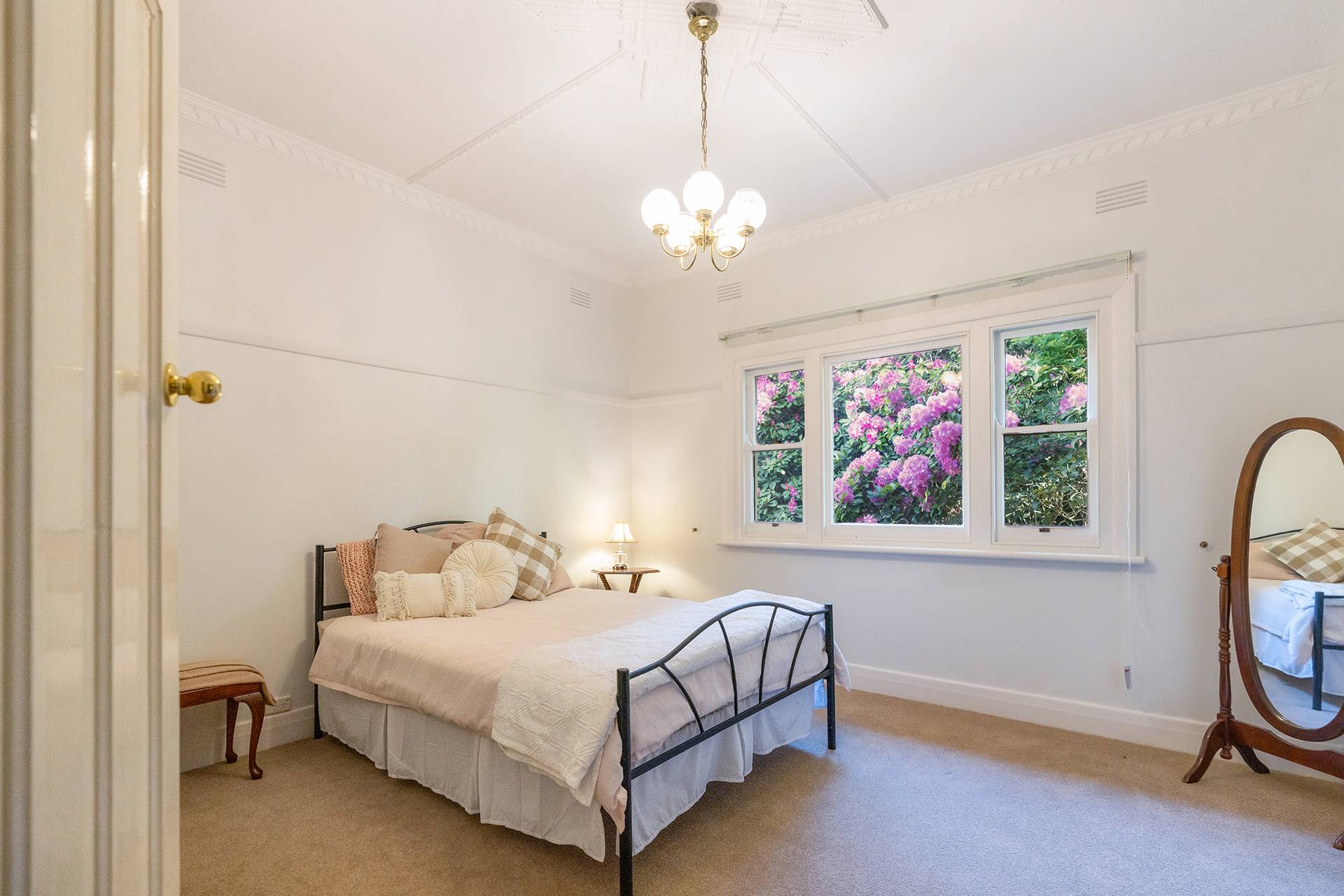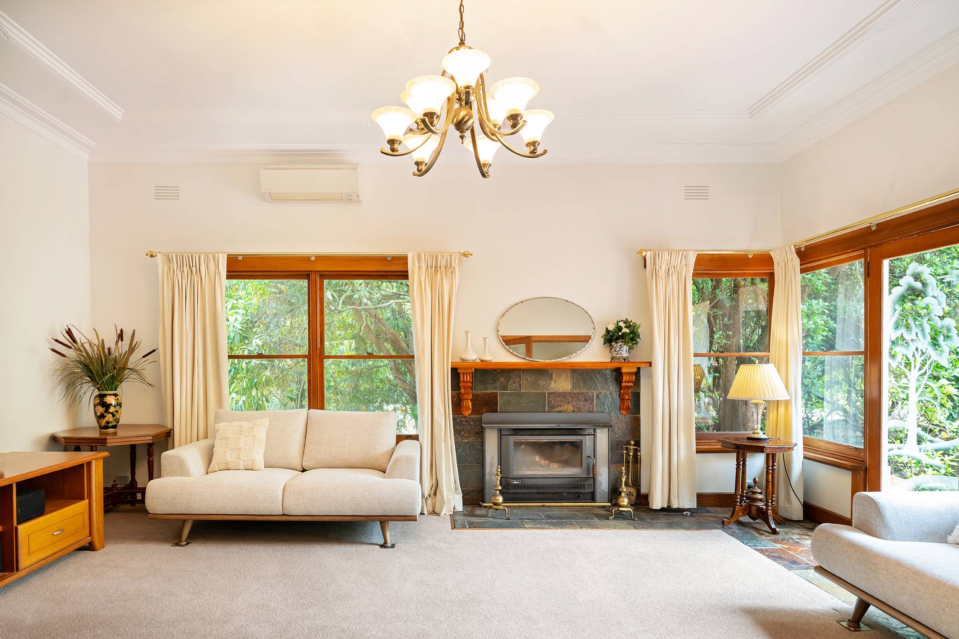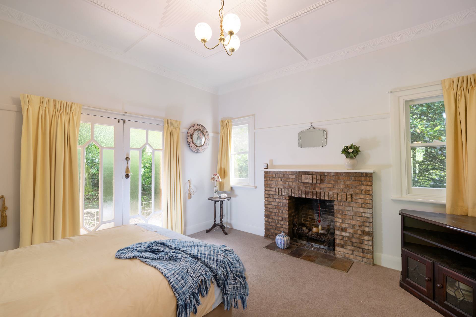 Inside, you'll discover a harmonious blend of character and comfort, featuring timber double-hung windows, 10-foot ceilings, ceiling roses, and decorative cornices from the 1940s. The home is freshly painted and newly carpeted. For year-round comfort, it includes Daikin reverse cycle air conditioning, an Ultimate wood fire, and open fireplaces.