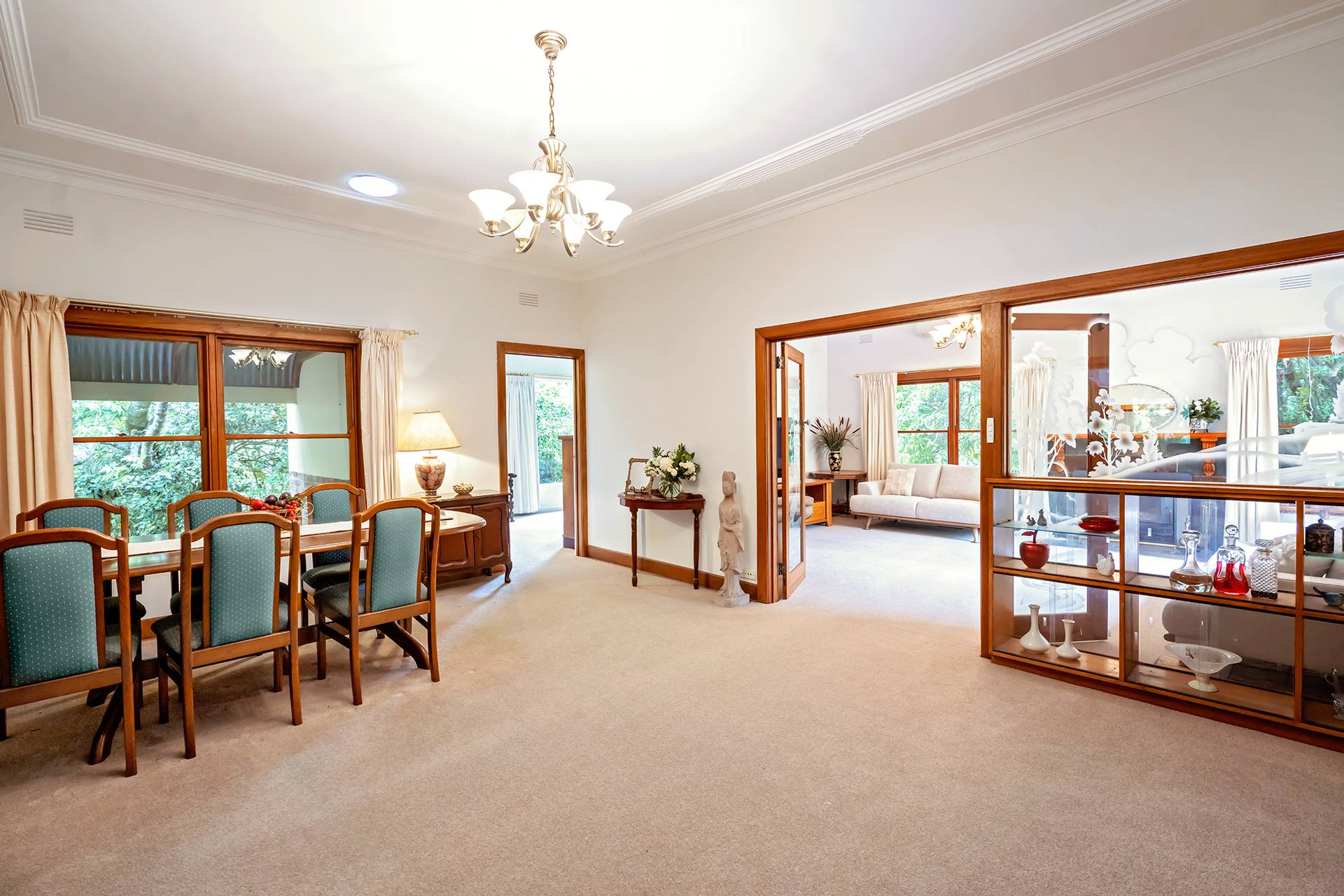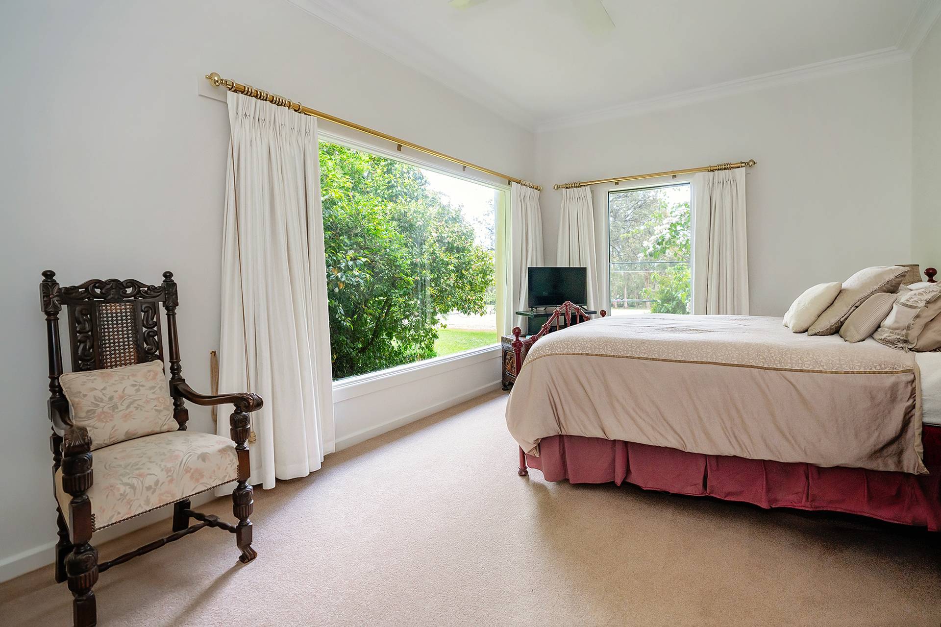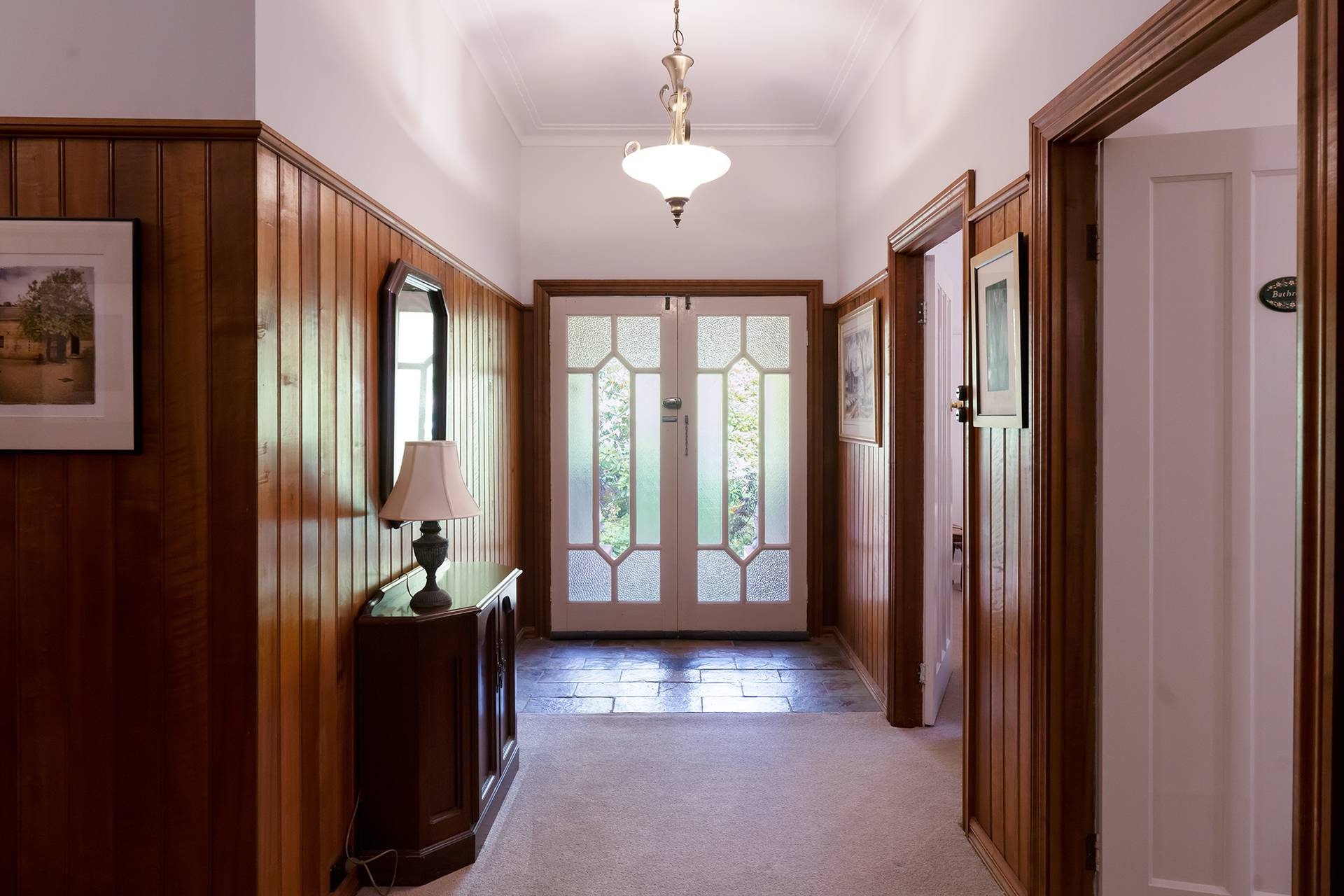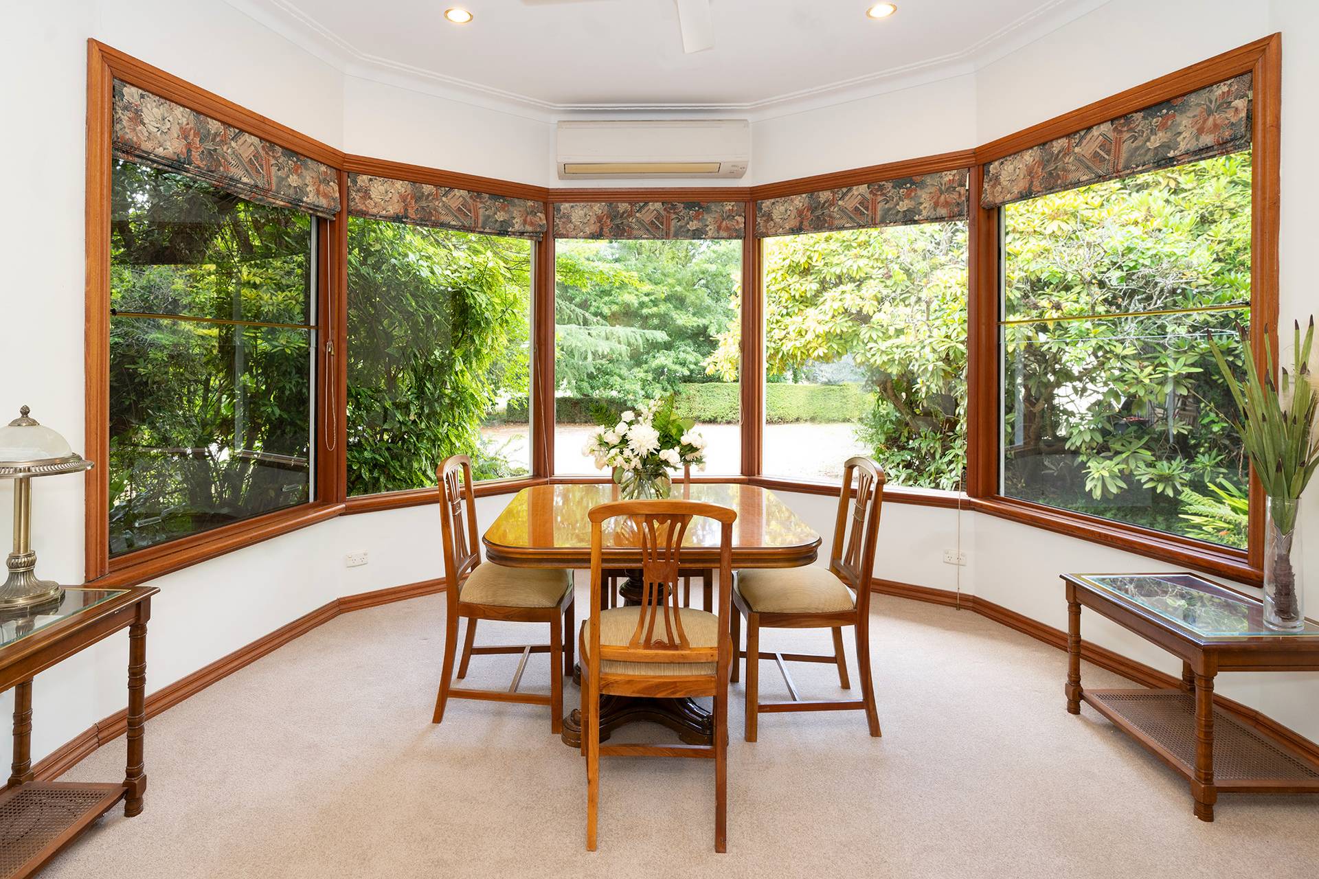 Inside, you'll discover a harmonious blend of character and comfort, featuring timber double-hung windows, 10-foot ceilings, ceiling roses, and decorative cornices from the 1940s. The home is freshly painted and newly carpeted. For year-round comfort, it includes Daikin reverse cycle air conditioning, an Ultimate wood fire, and open fireplaces.