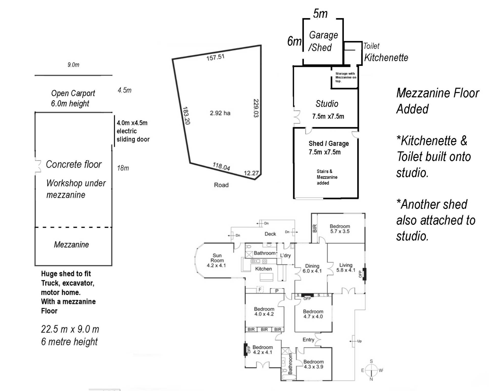 A second shed (7.5m x 7.5m) with a full mezzanine for added storage, and a (6m x 5m) shed for extra practicality.