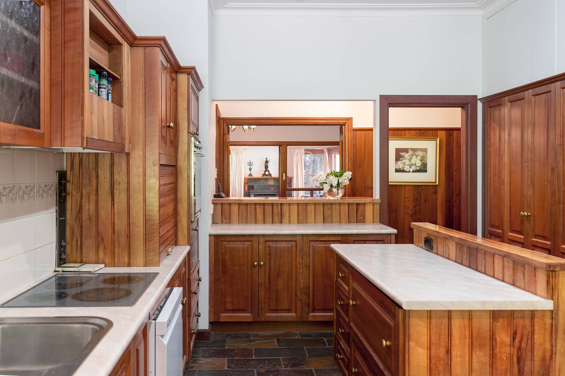 The Tassie oak kitchen is both functional and elegant, featuring double cupboards, a Smeg in-wall oven, LG dishwasher, and electric 600mm hot plates.