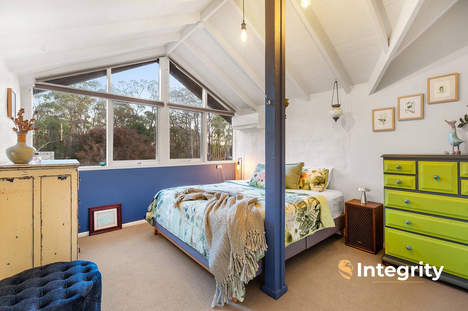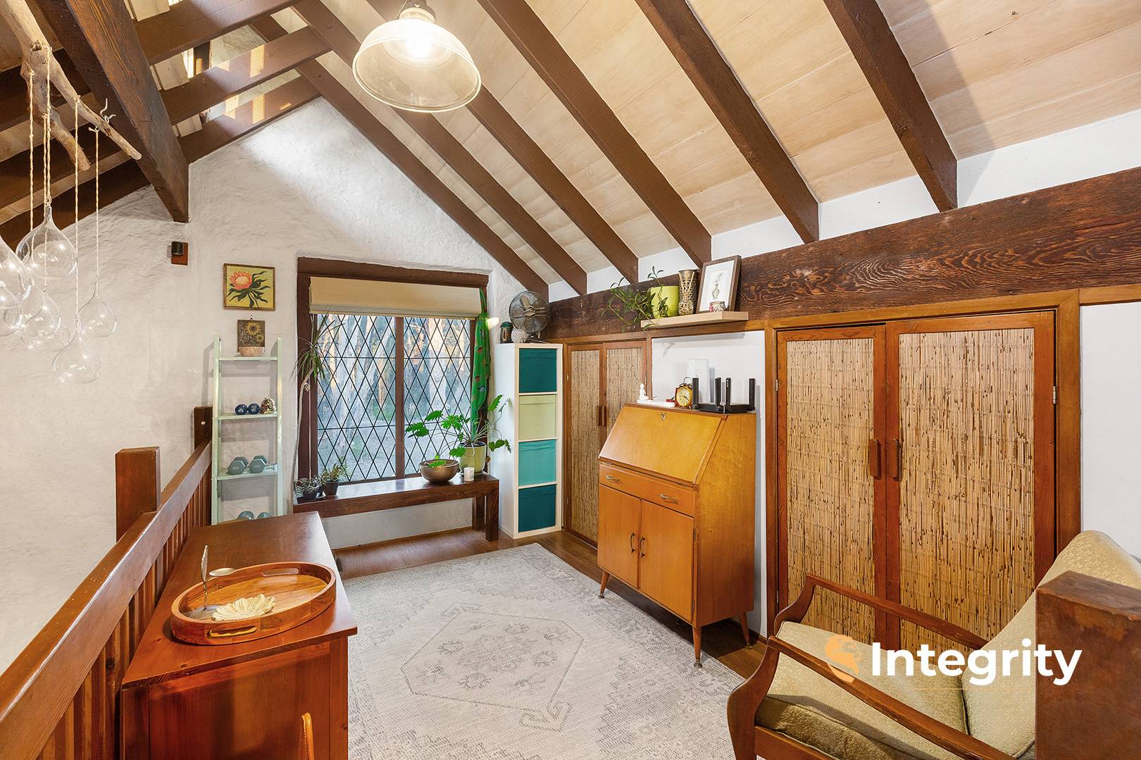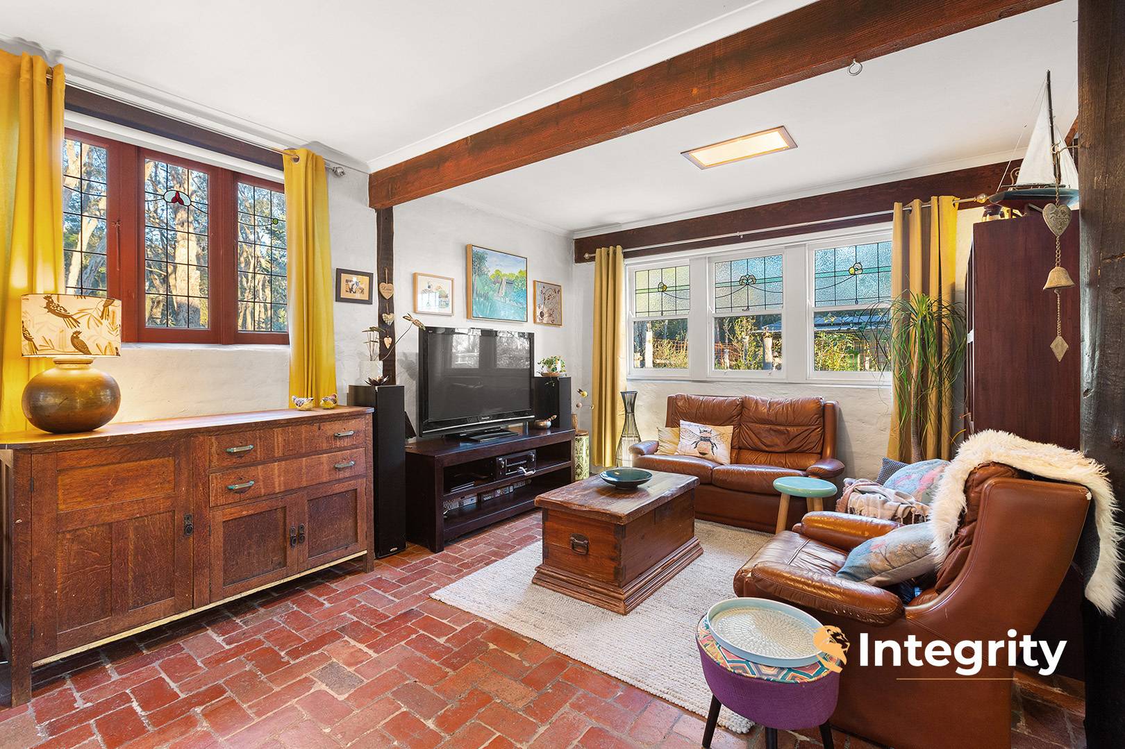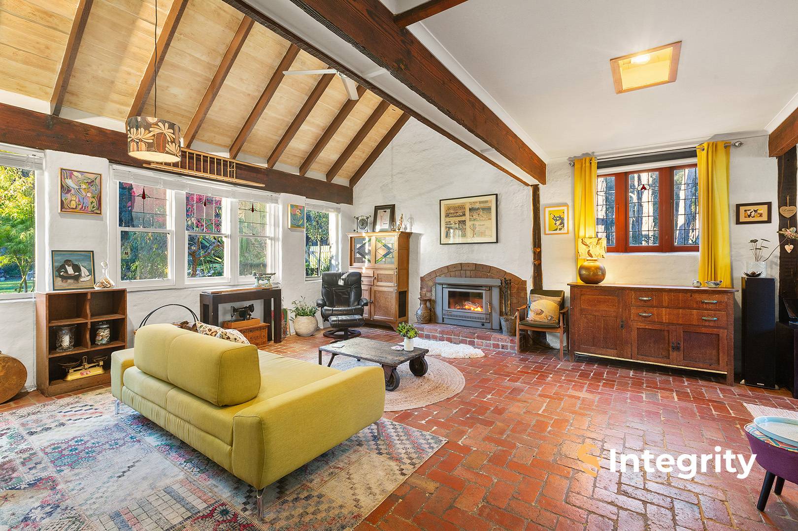 Be inspired by this one of a kind mudbrick home featuring 4 generous sized bedrooms, 2 with built-in robes and all soaked in natural light. 2 bathrooms including an ensuite to master with double vanity and sweeping views across the property. The unique design, with its stack-stone / mudbrick façade and clerestory windows deploys reclaimed hardwood timbers, solid red brick floors and dreamy stained glass.
