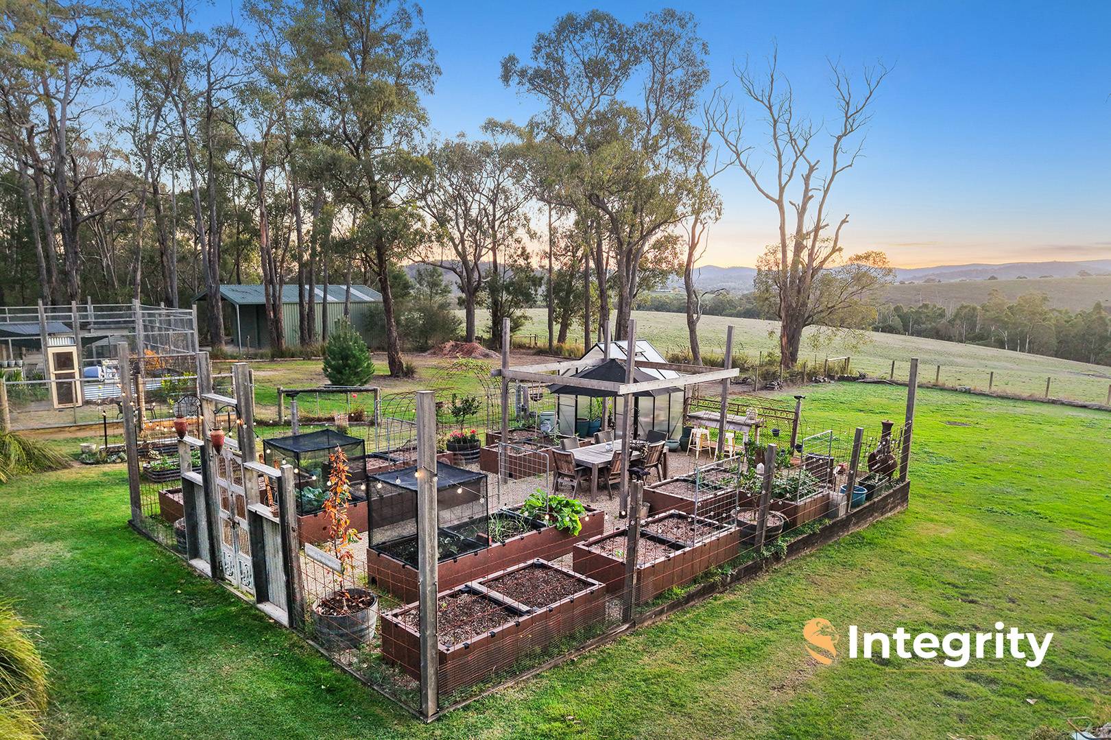 For the homesteader at heart, there is a fully secure chicken palace allowing chickens the freedom to roam safely. Multiple fruit and nut trees and an expansive vegetable garden featuring raised wicking beds.