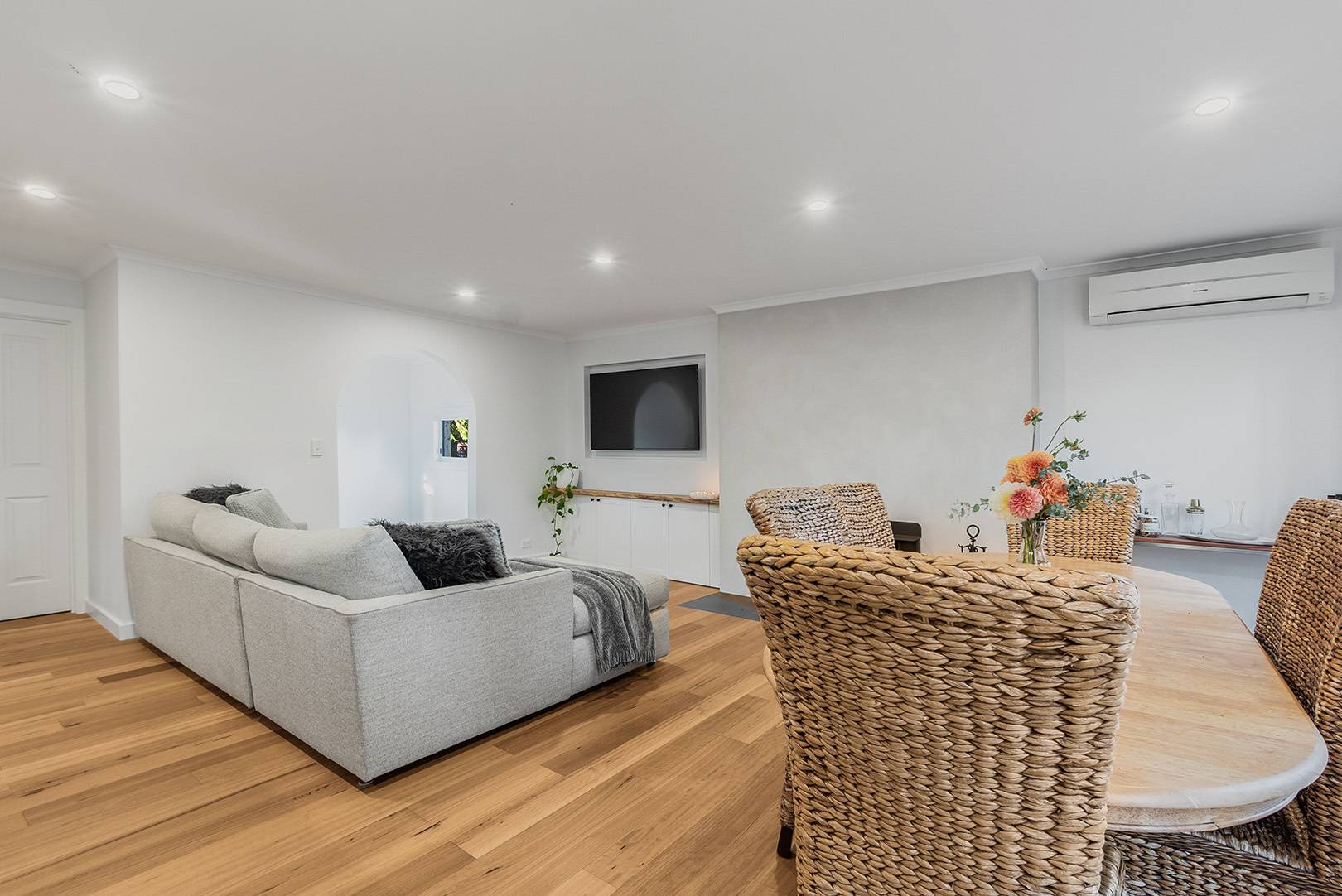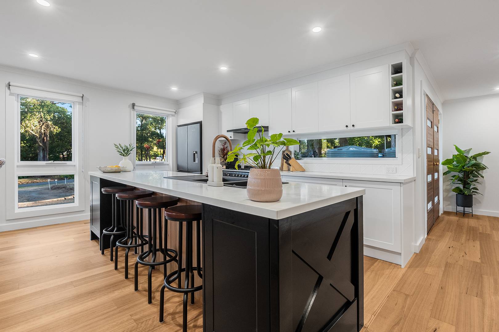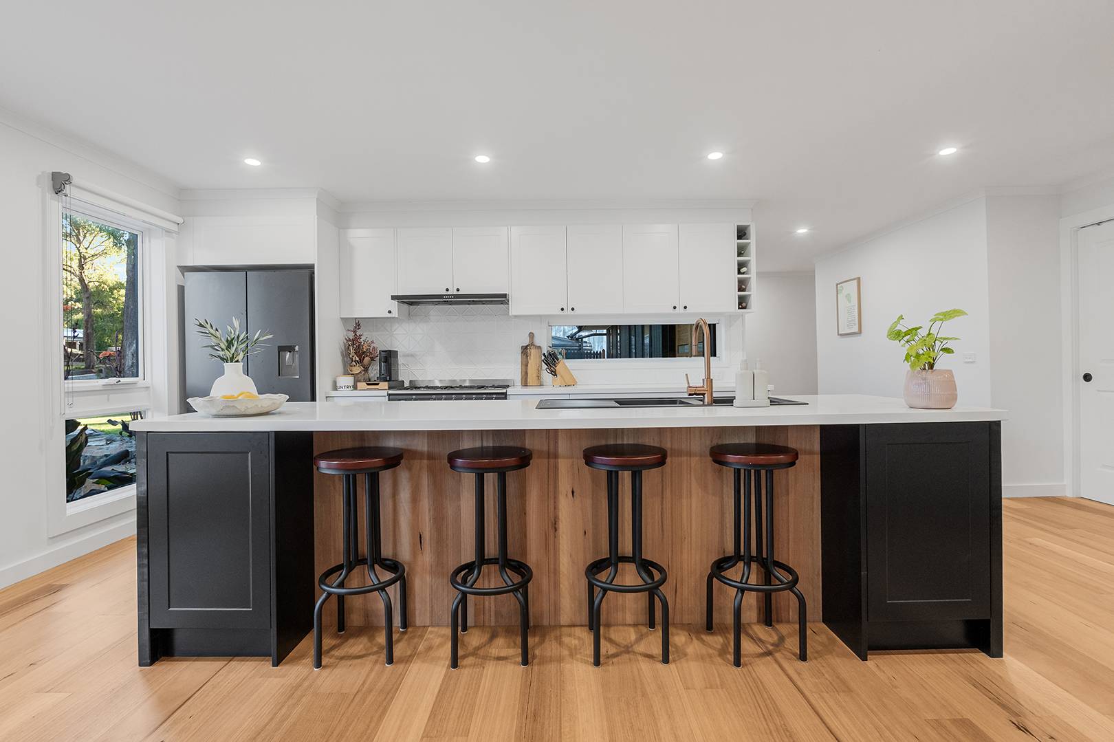 At the heart of the home, the open-plan kitchen, living and dining area exudes both elegance and functionality. Premium Smeg appliances, a plumbed fridge, Caesarstone benchtops, and rich engineered Blackbutt flooring create a warm and inviting space for everyday living and entertaining.