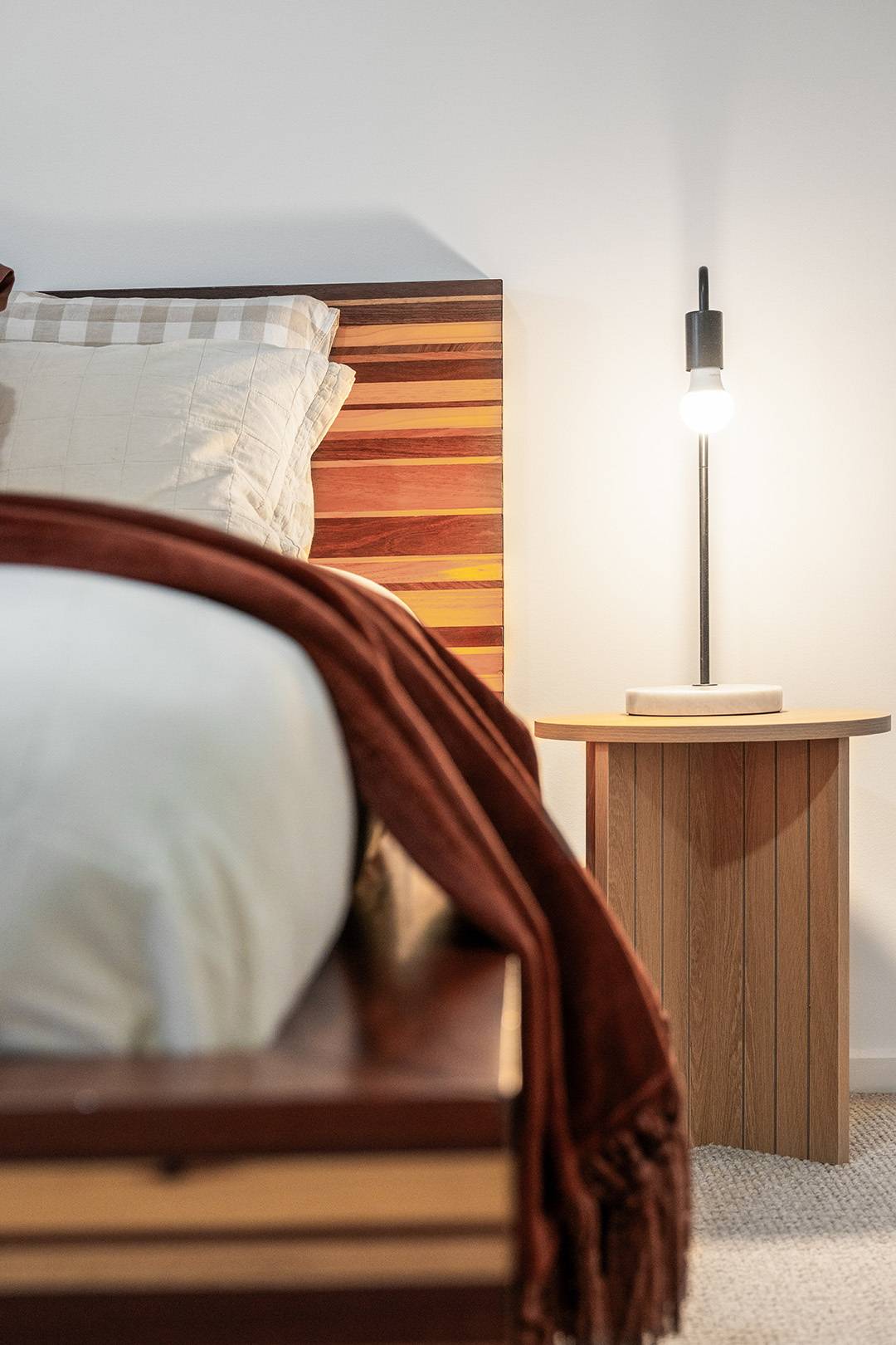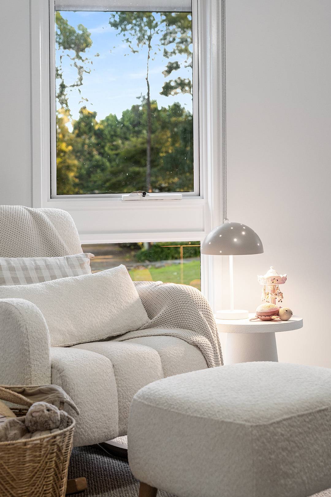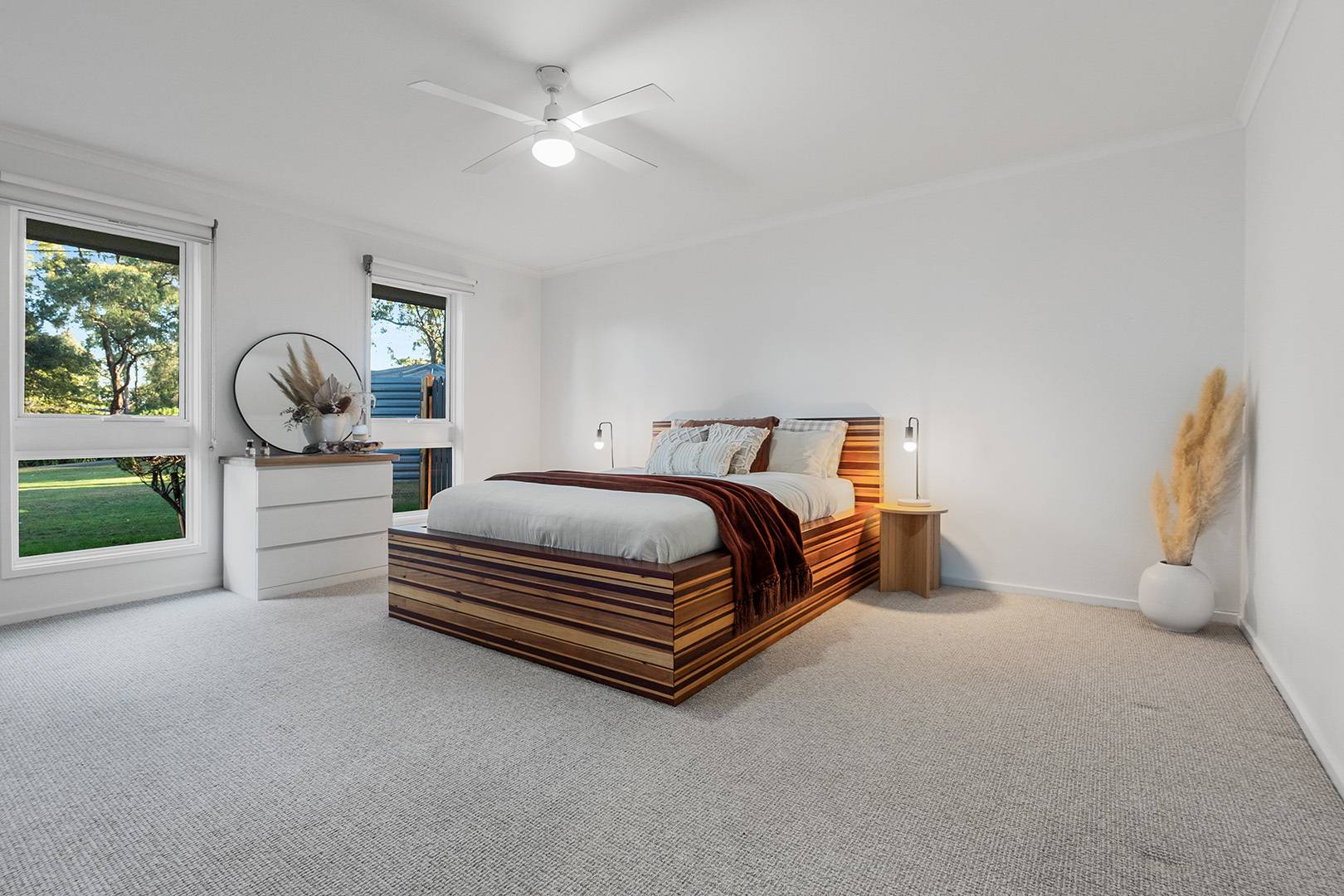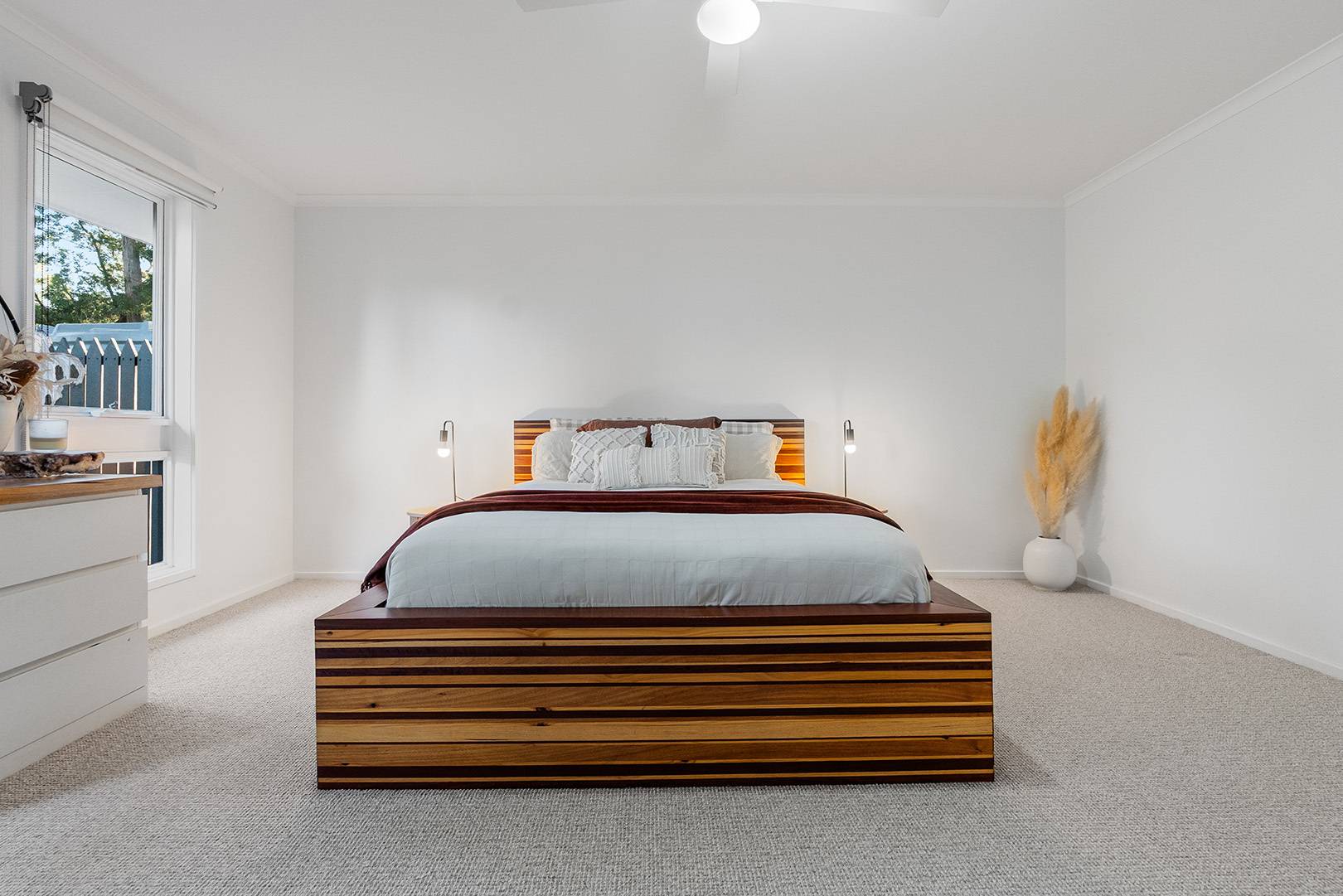 At the heart of the home, the open-plan kitchen, living and dining area exudes both elegance and functionality. Premium Smeg appliances, a plumbed fridge, Caesarstone benchtops, and rich engineered Blackbutt flooring create a warm and inviting space for everyday living and entertaining.