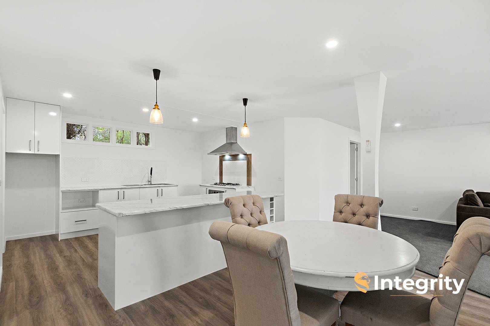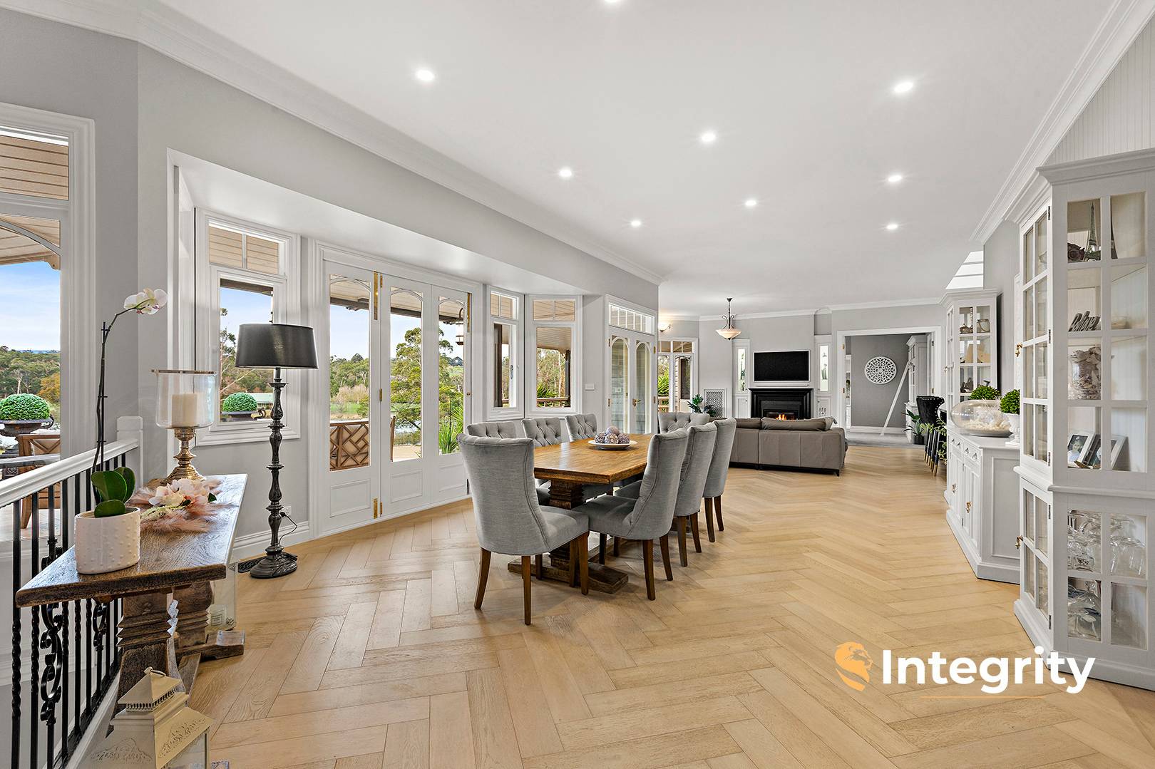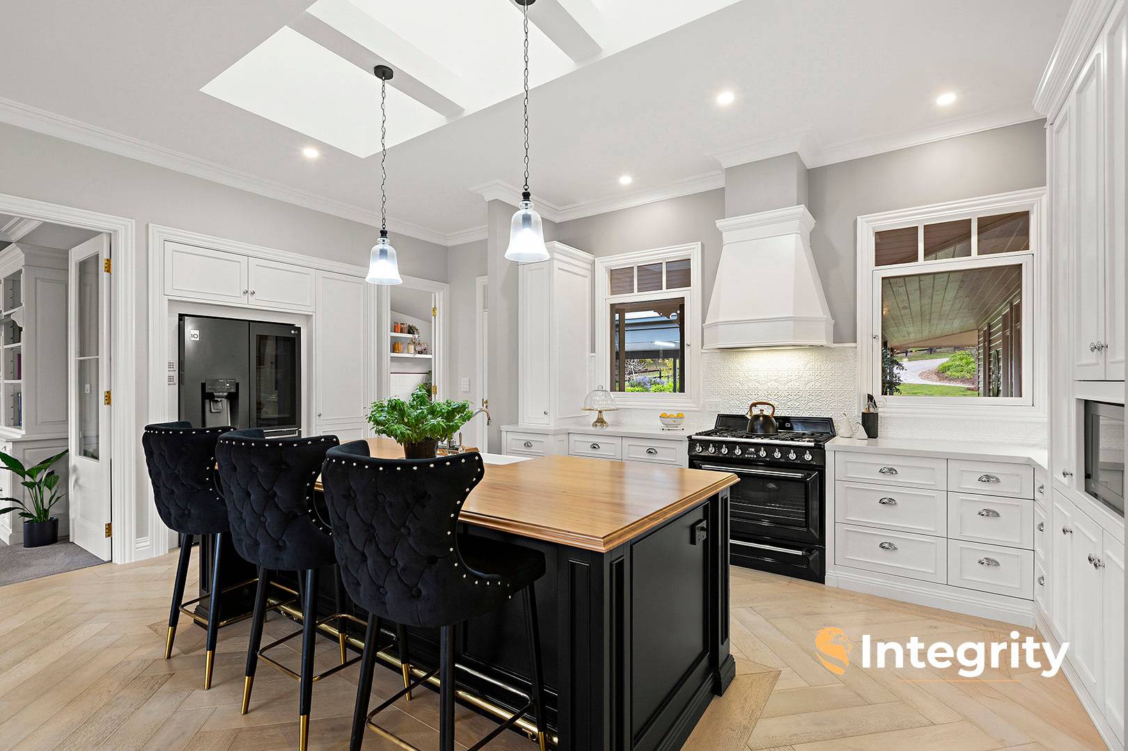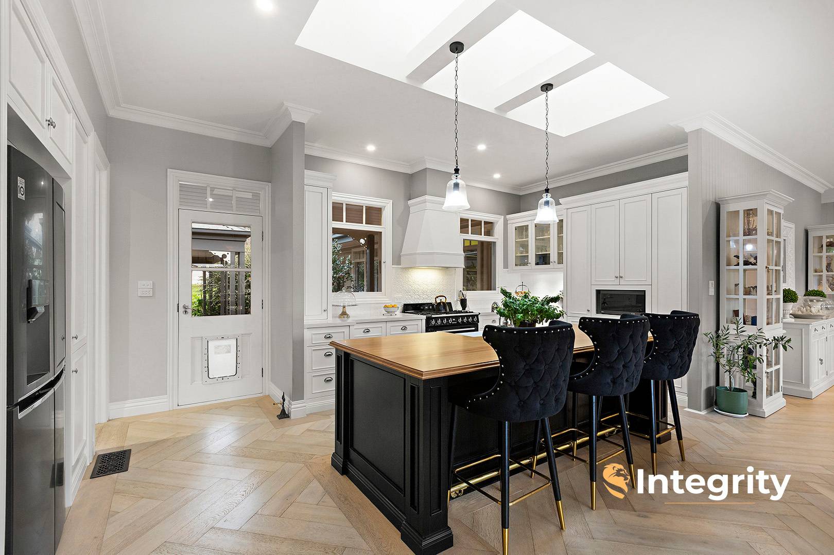 The home's central family / dining room features French oak herringbone flooring. The bespoke shaker-profile kitchen cabinetry is 2pac painted, complementing stone and timber benches, ceramic sink in the butler's pantry, integrated appliances, Phoenix Hamptons tapware, pressed tin splashbacks and a 900 mm Smeg oven and cooktop.