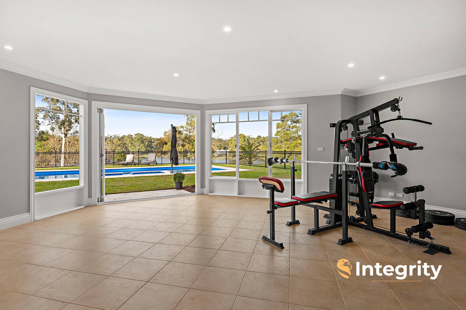 By way of an impressive wrought iron staircase downstairs, there is a large gymnasium and entertainment room with bi-fold doors to the pool.