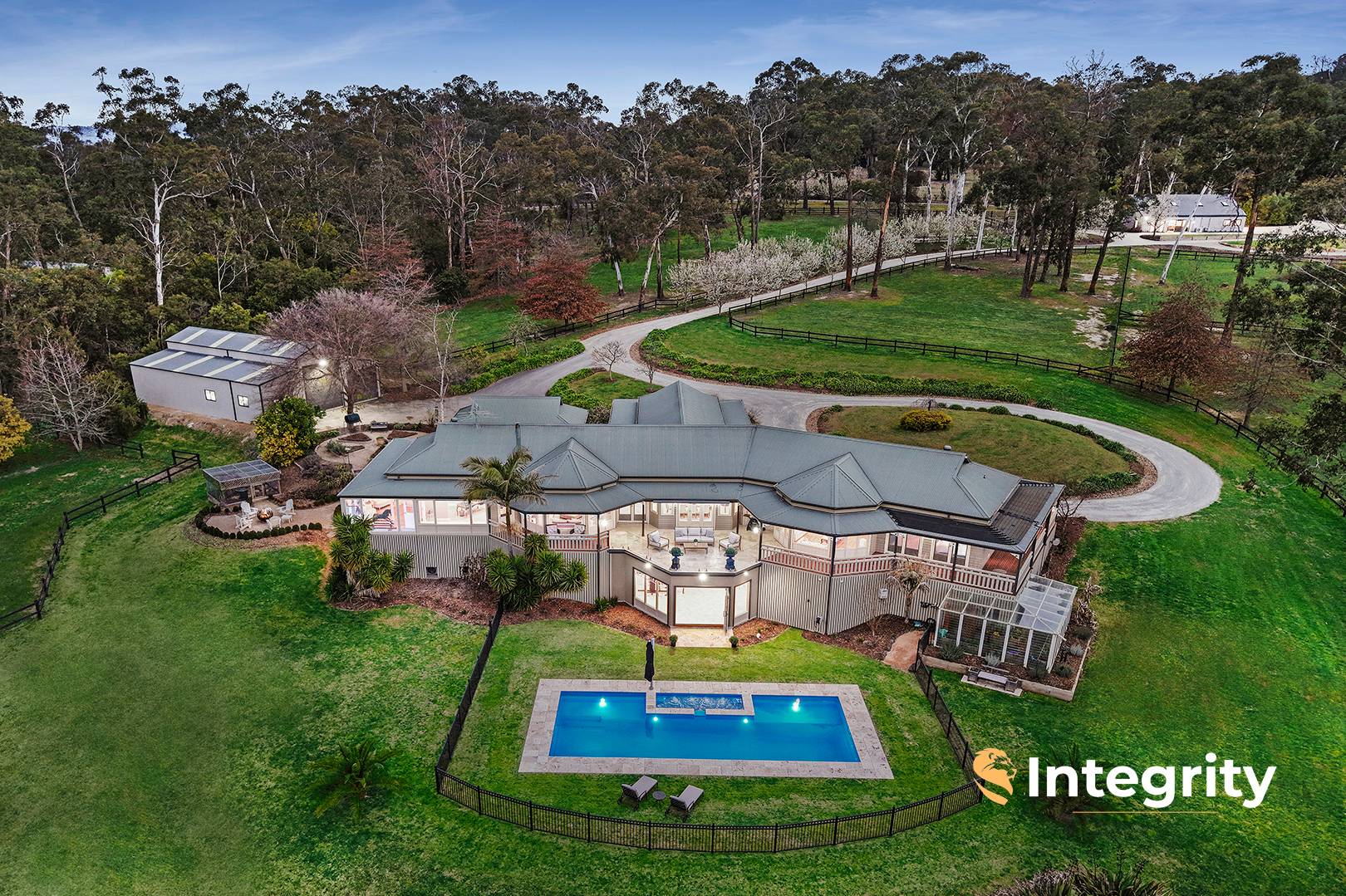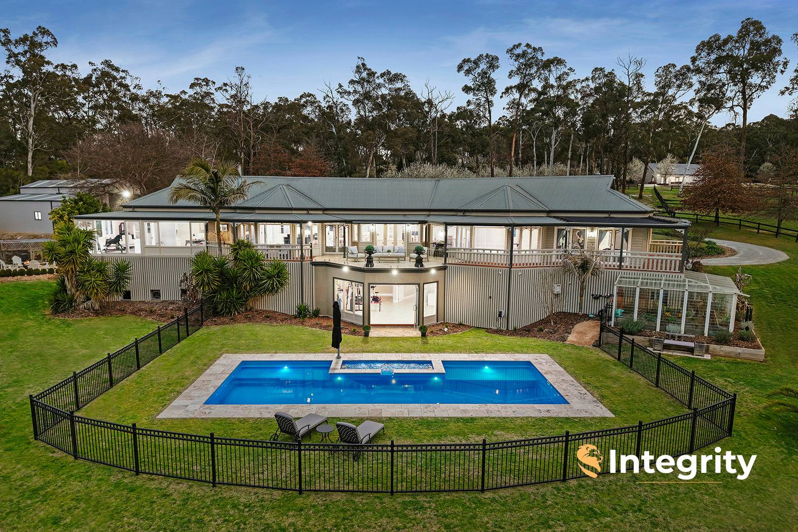 The property is fully fenced, secured with 5 m heavy duty steel electric sliding entry gate, complemented by exposed aggregate concrete driveway.