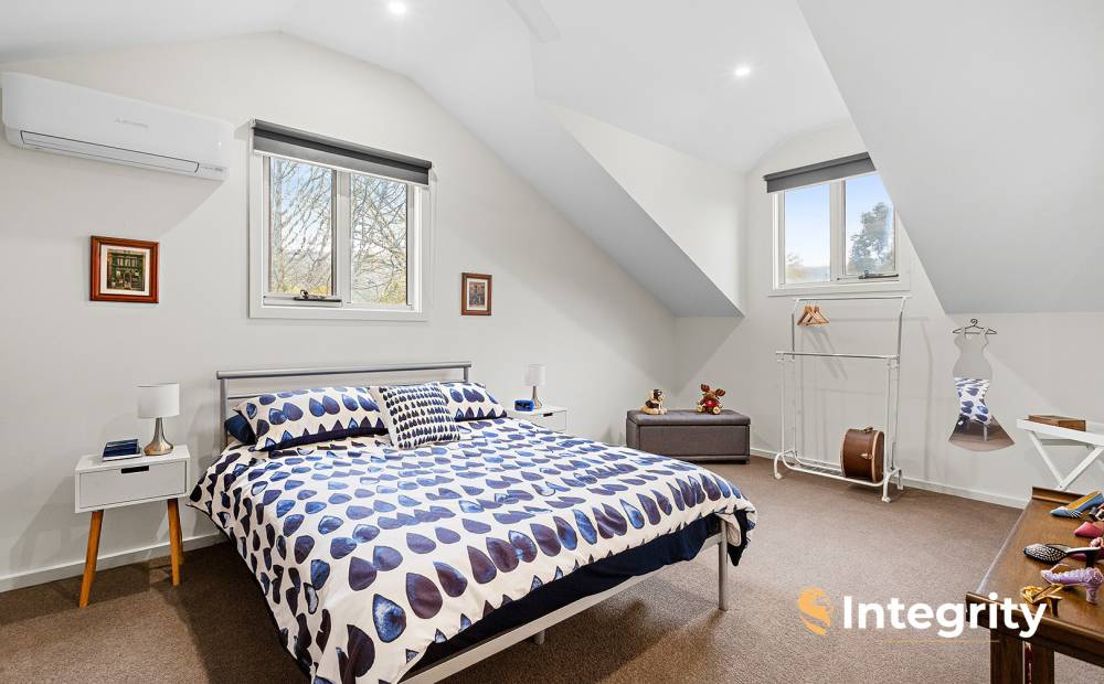 The home comprises 2 bedrooms plus study or potential third bedroom, and en suite bathroom with clawfoot bath and shower. Upstairs is the 3.69 m x 7.43 m mezzanine bedroom with ceiling fans, and downstairs the master bedroom with walk-in robe. The home is heated and cooled by 2 reverse cycle split systems and a wood heater.