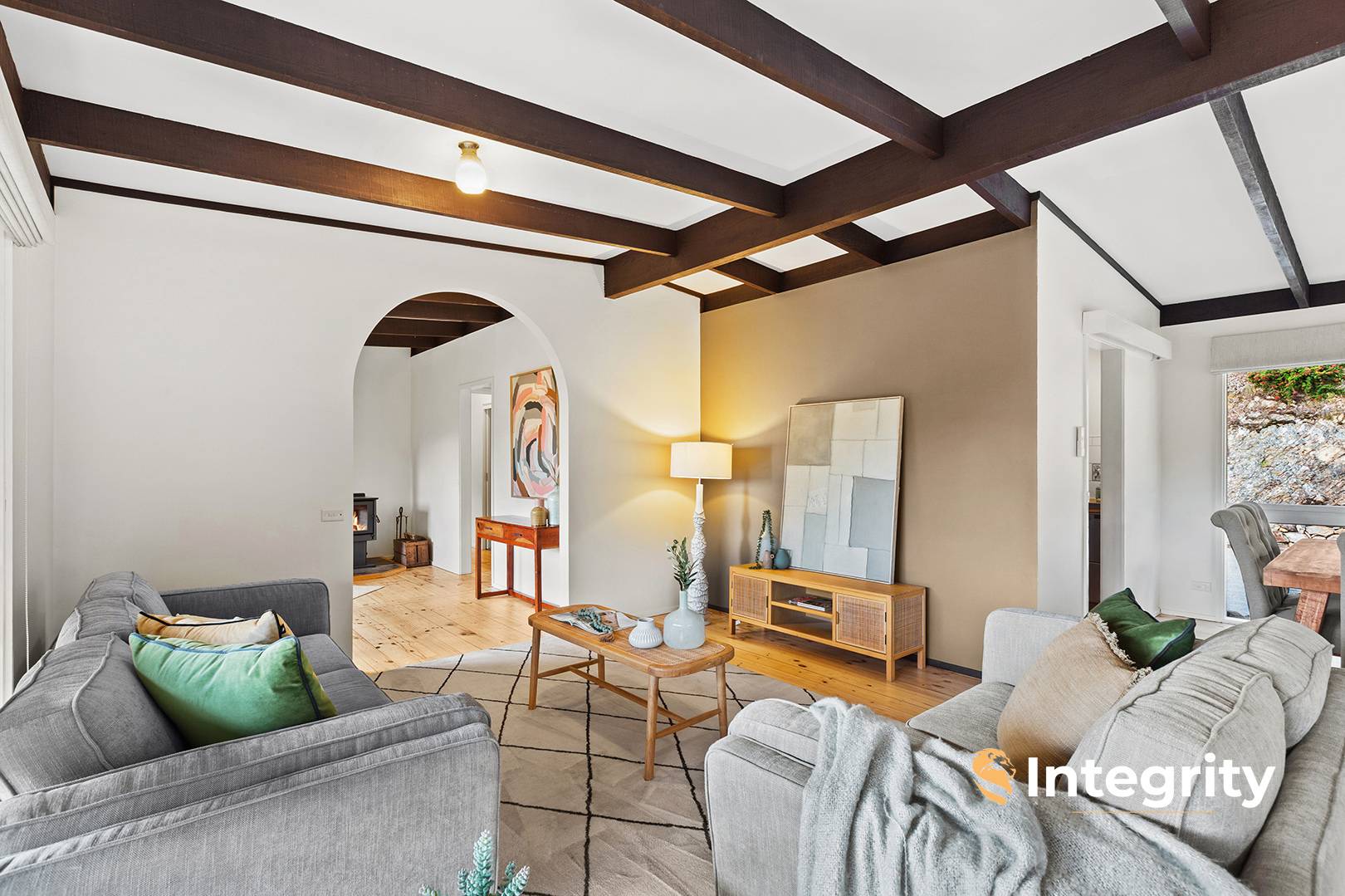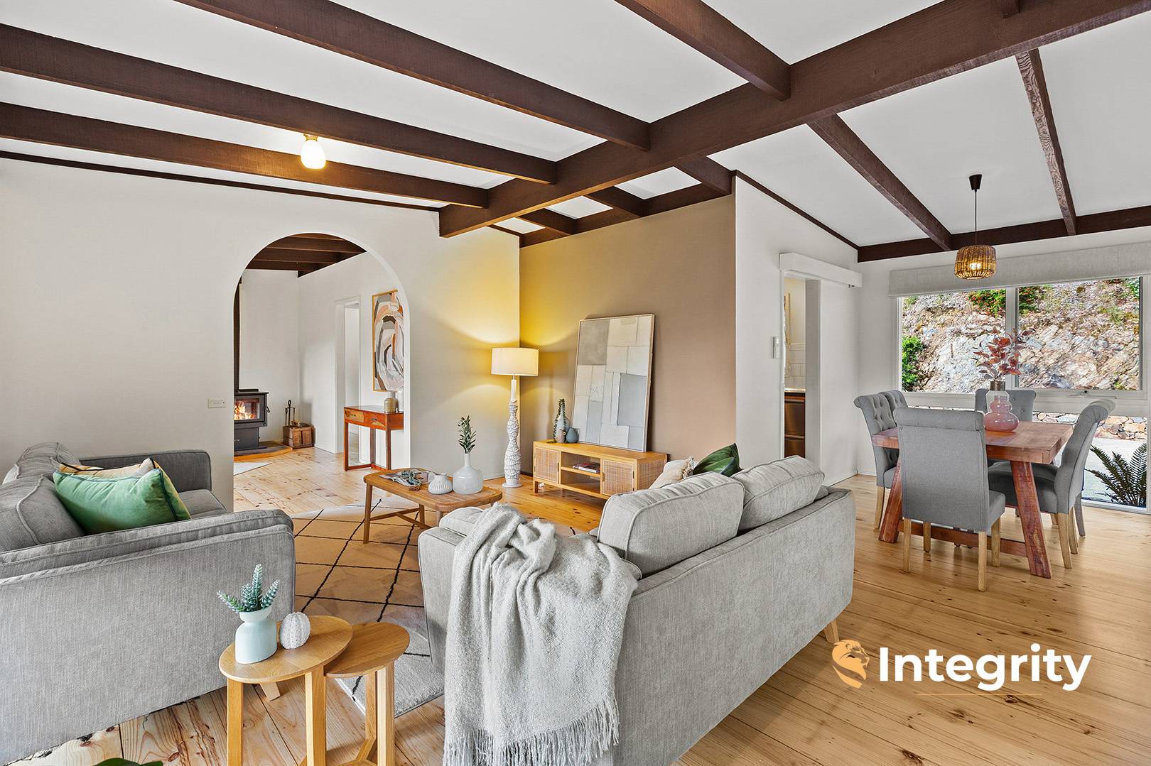 The three-bedroom, two-bathroom home has been thoughtfully designed to embrace its natural surroundings. A covered alfresco entertaining area with jacuzzi spa flows effortlessly into three living zones, including a light-filled kitchen and meals area, a spacious family living room, and a formal lounge with wood heater-perfect for cosy winter evenings. Four split-system air conditioners ensure comfort throughout the seasons.