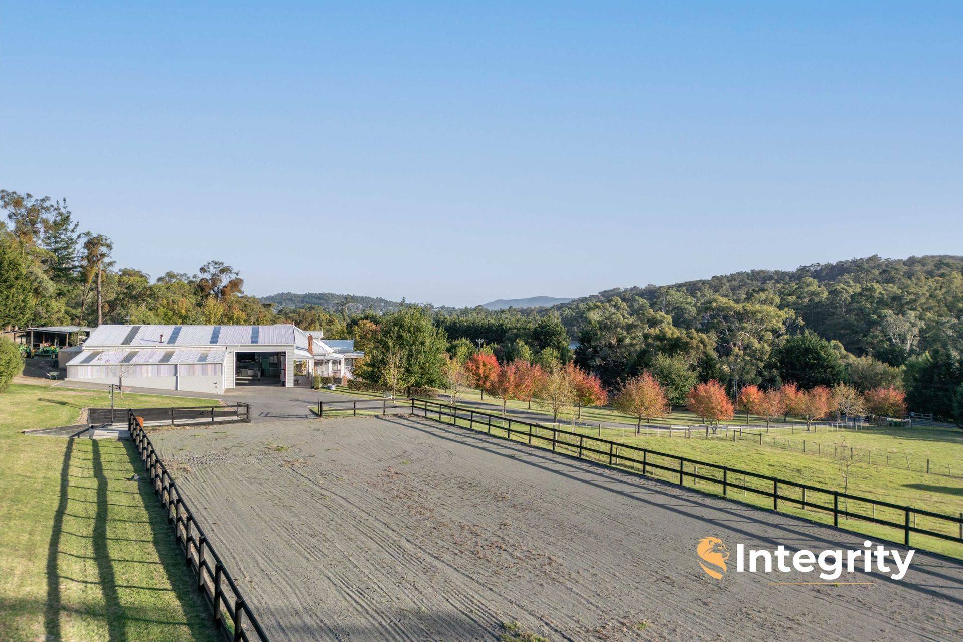 The 9.5 acre property, with its 420 m of frontage, is connected to 3 phase power underground. Vehicle access is fully asphalted, over-spec to 80 mm class-A road base. The grounds are fenced into 8 paddocks with shelters and water. Stock water may be further supplied by a rain-fed dam. Finally, a full-size 60 m x 20 m manege completes this property's equestrian attraction.