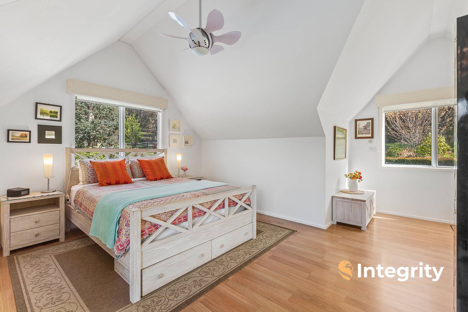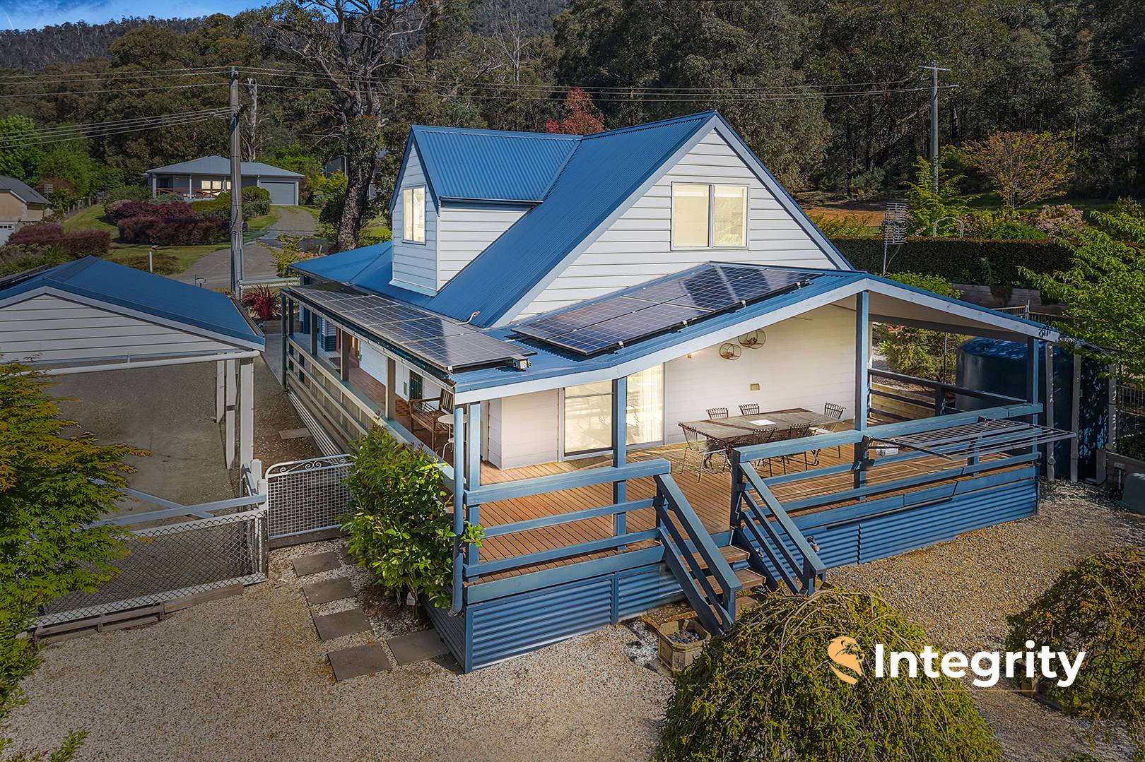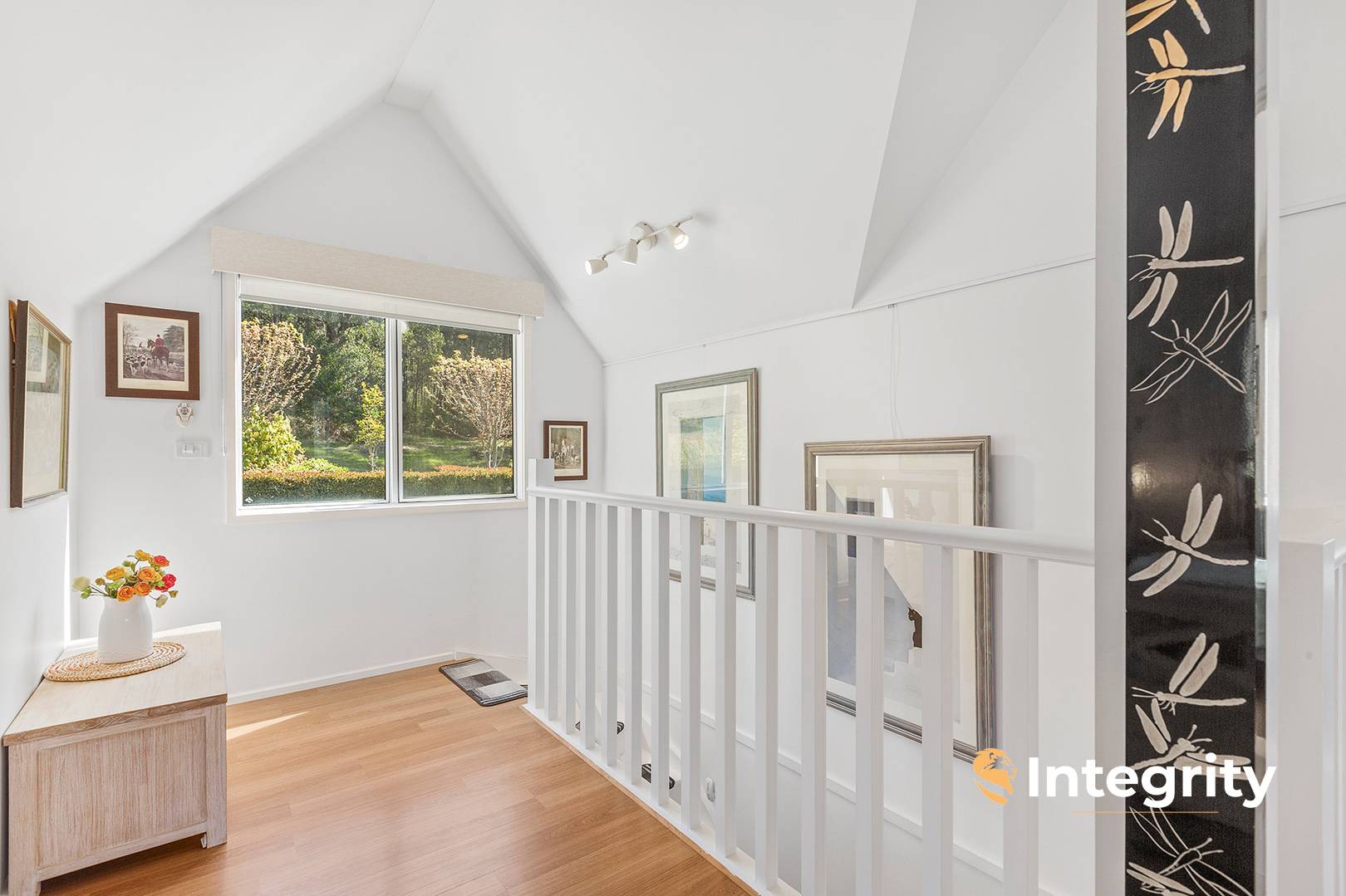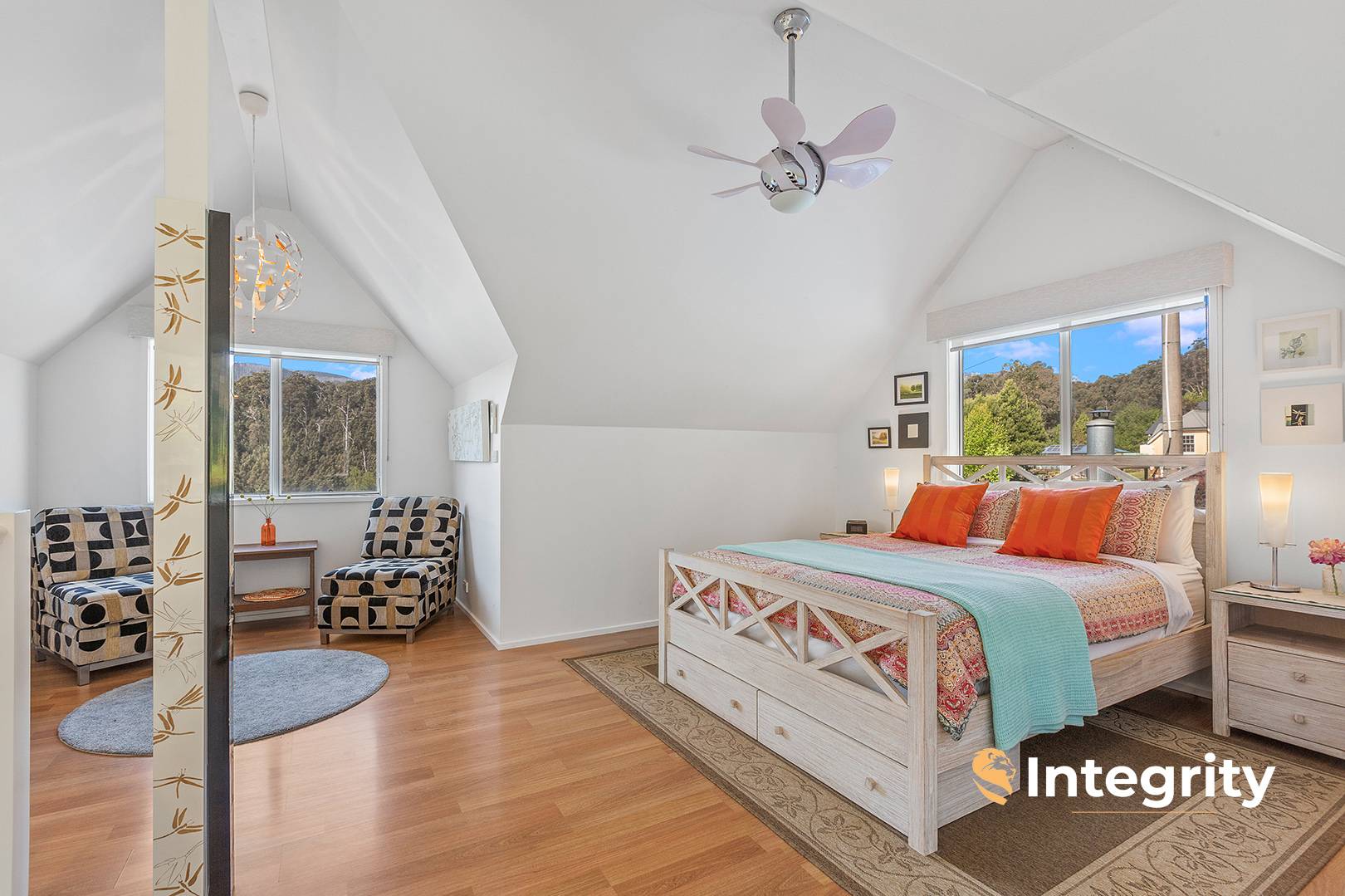 Inside, the home is rich in character and warmth. The upper level features a spacious main bedroom with walk-in robe (or optional third bedroom), a cosy sitting area, and picturesque scenic views. Ceiling fans are installed in the main bedroom upstairs and the main family room downstairs for added comfort.