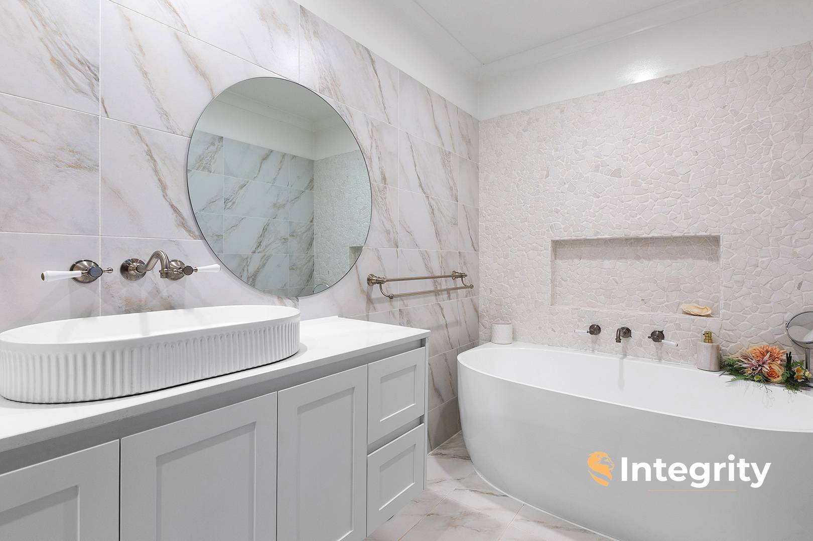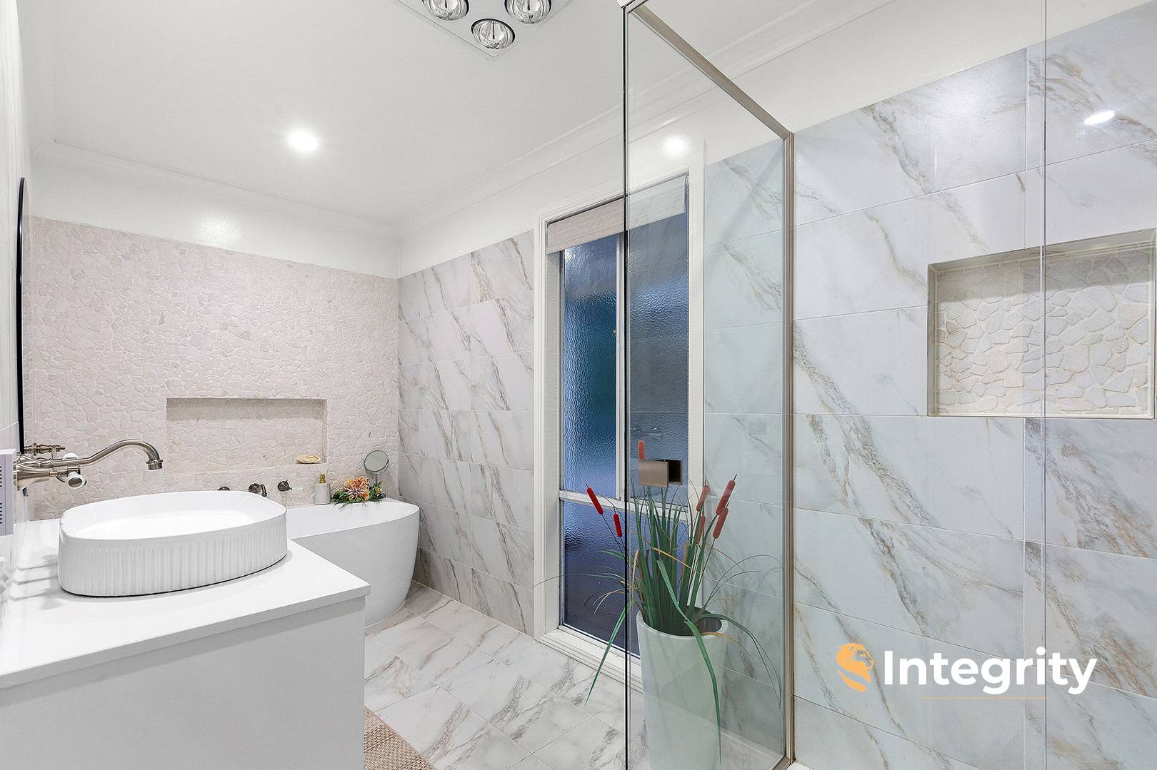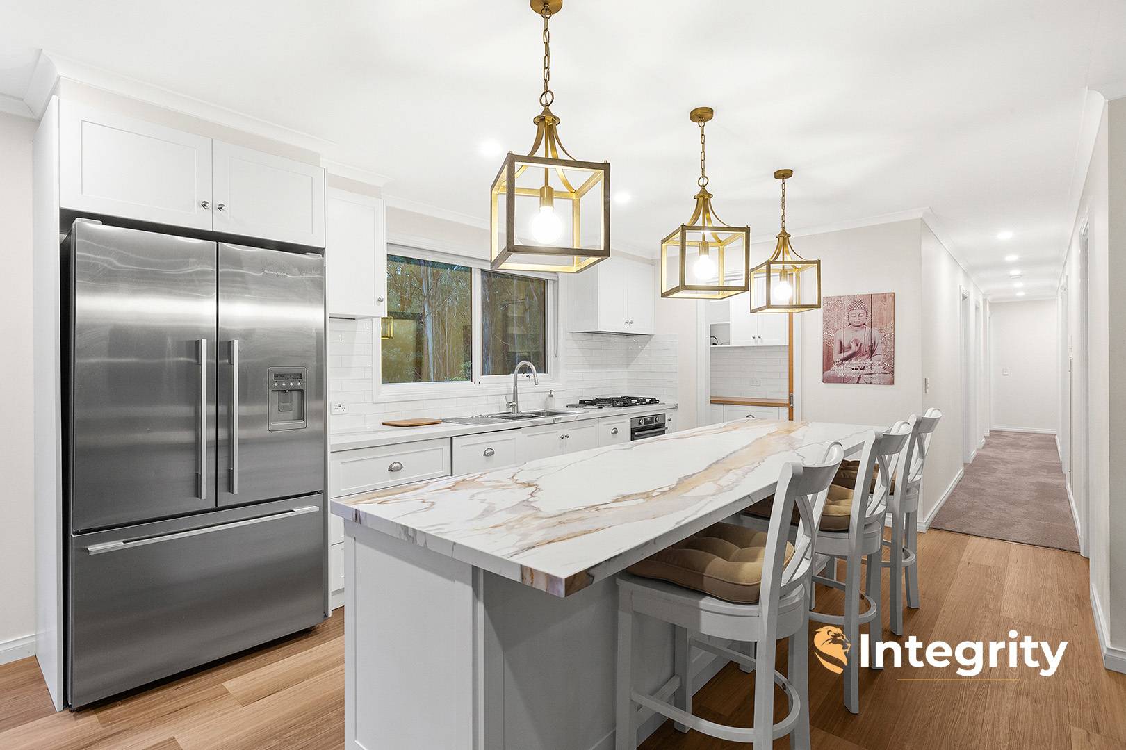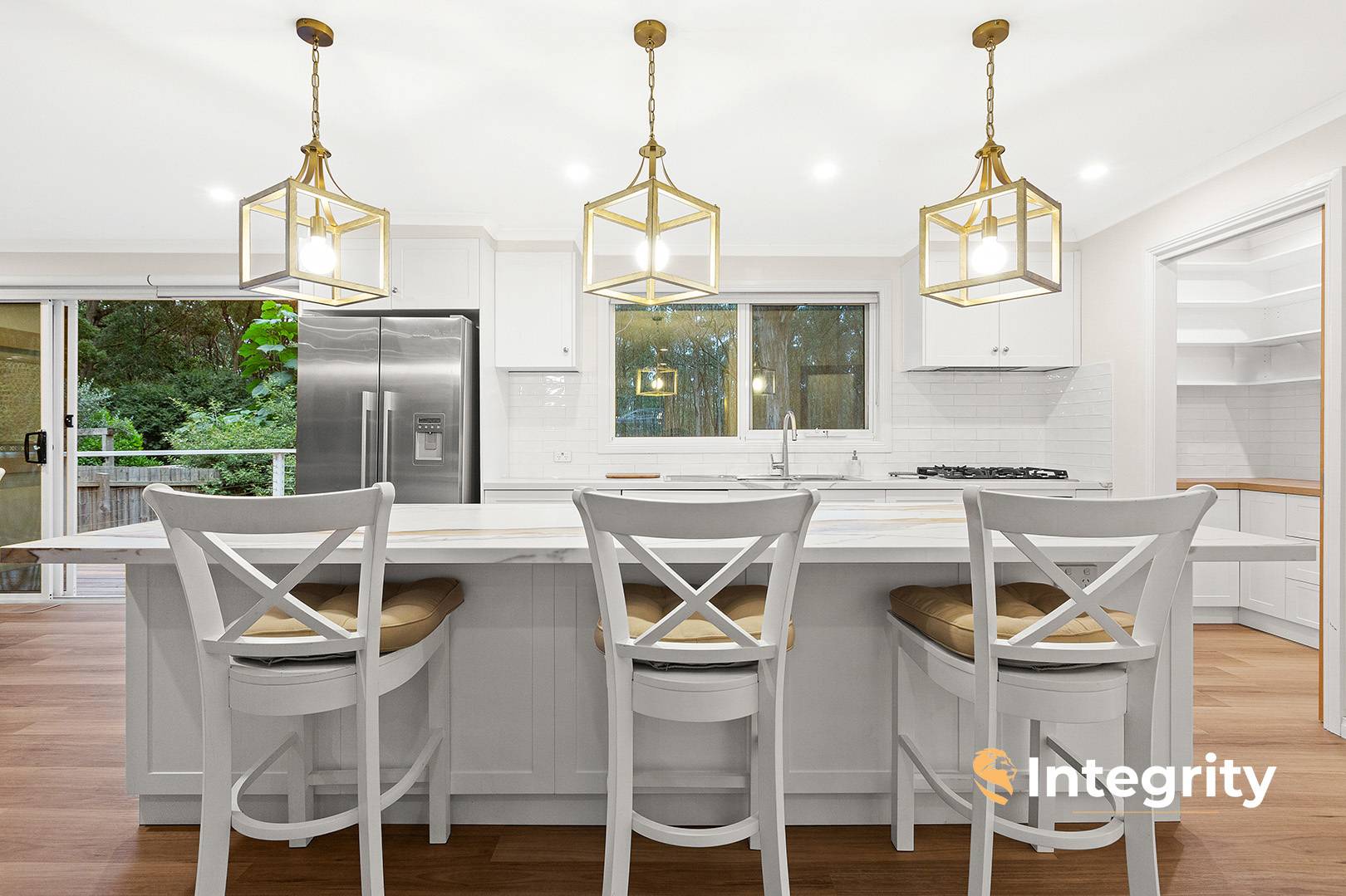 Standout features include a kitchen walk-in pantry, bespoke high-end stone benchtops, French door fridge cavity, and a beautifully appointed bathroom with a semi-freestanding bath, large shower, and heated flooring.